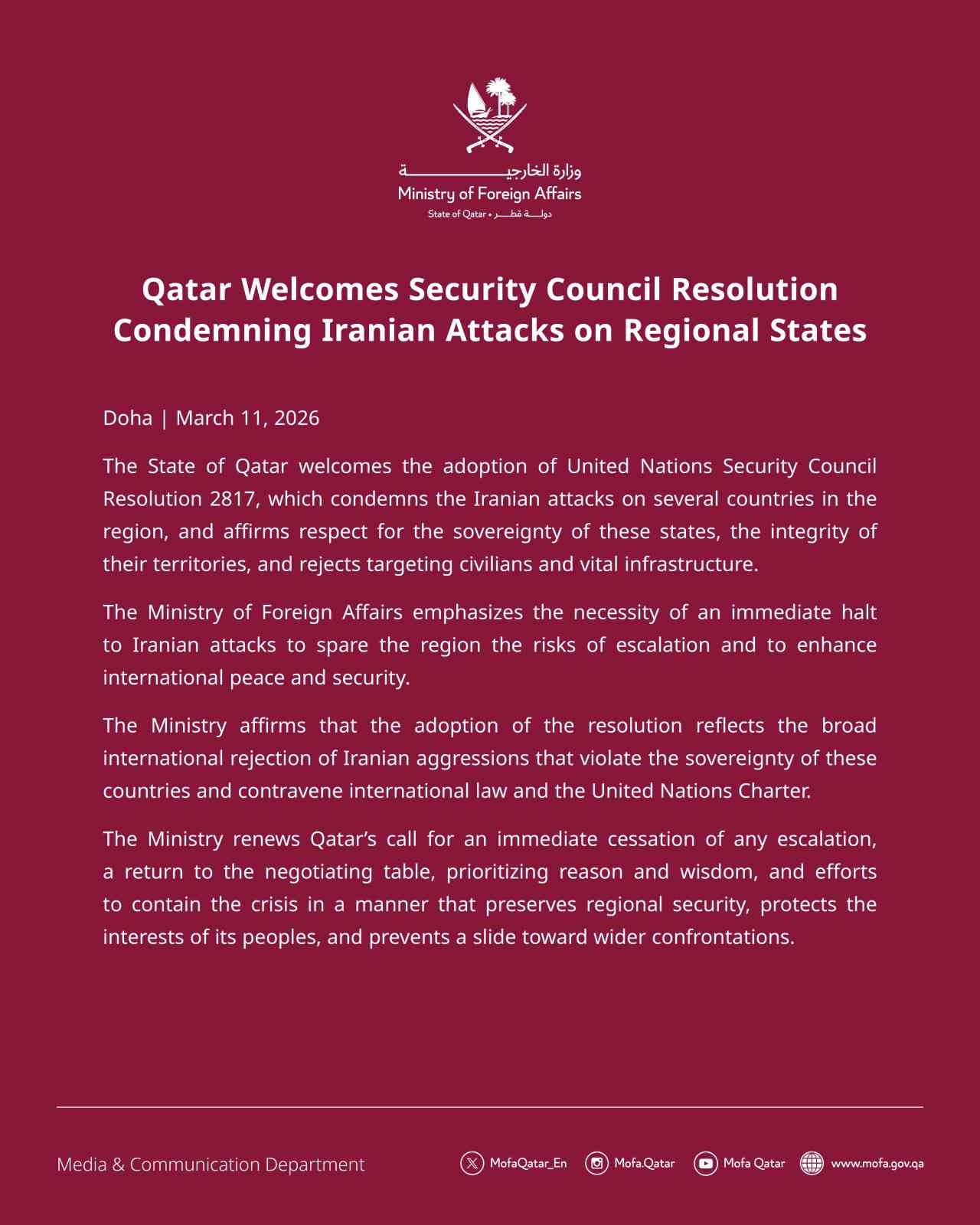 BM’nin kararının, İran’ın BM Sözleşmesi’ne ve uluslararası hukuka aykırı saldırılarının uluslararası anlamda reddedildiğini gösterdiği belirtilerek, “Katar’ın her türlü gerilimin derhal sonlandırılması, müzakere masasına geri dönülmesi, akıl ve bilgeliğin önceliklendirilmesi ve bölgesel güvenliği koruyacak, halklarının çıkarlarını güvence altına alacak ve daha geniş çaplı çatışmalara doğru ilerleyişi önleyecek şekilde krizin kontrol altına alınması yönündeki çağrısını yineliyoruz” ifadeleri kullanıldı.
