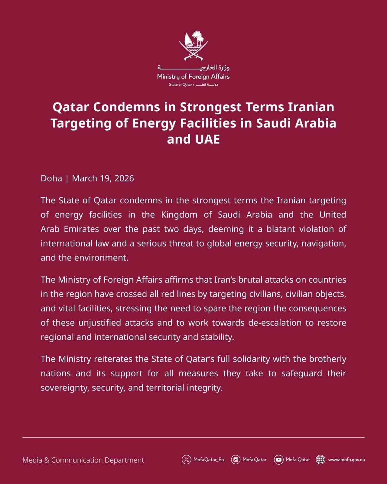 Katar Dışişleri Bakanlığı, İran’ın Suudi Arabistan ve Birleşik Arap Emirlikleri’ndeki (BAE) enerji tesislerine yönelik saldırılarının şiddetle kınandığını vurgulayarak, “İran’ın bölgedeki ülkelere yönelik acımasız saldırıları sivilleri, sivil altyapıları ve hayati tesisleri hedef alarak tüm kırmızı çizgileri aşmıştır” açıklamasında bulundu.