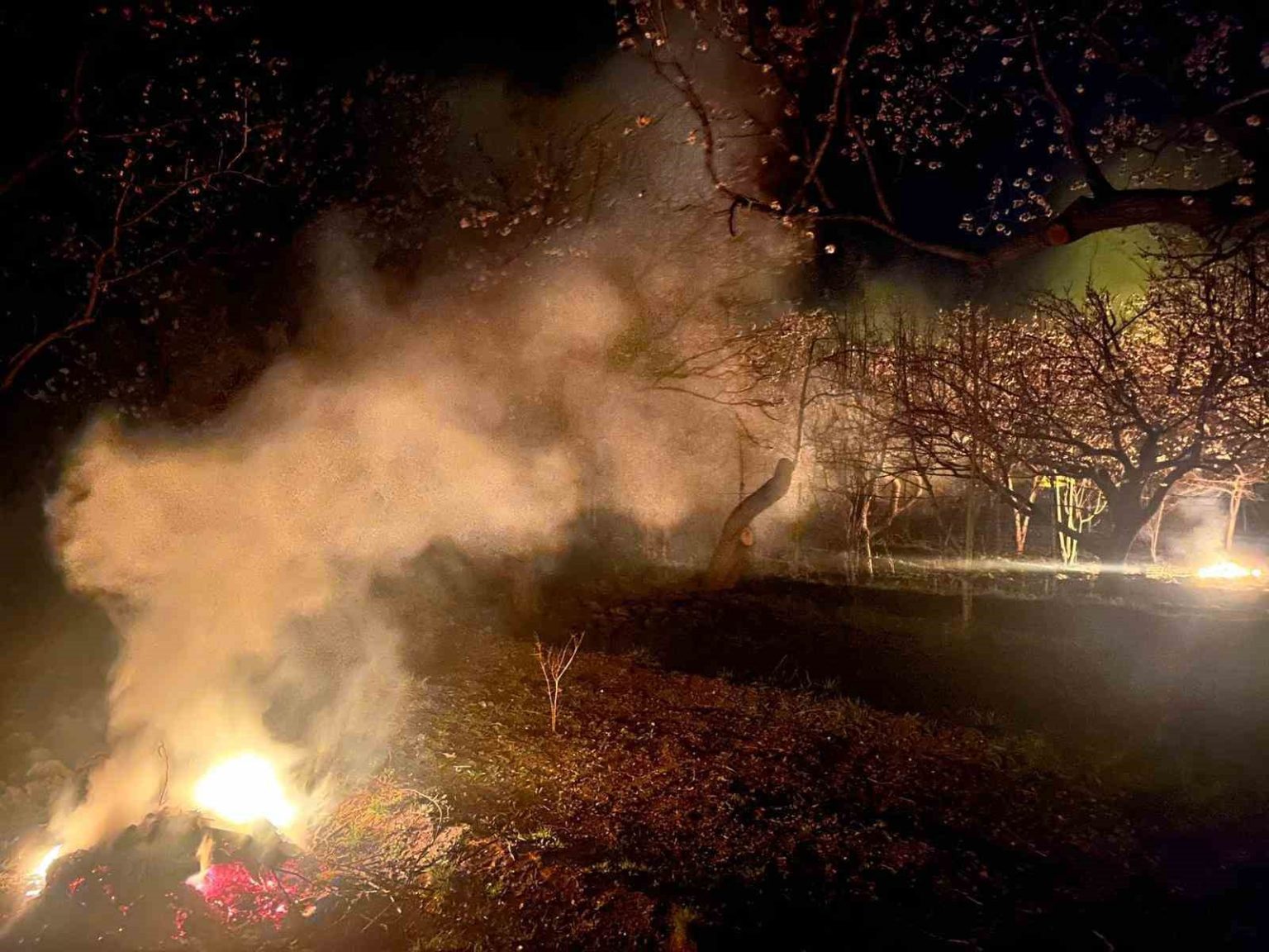 Kağızman’da uzun yıllardır devam eden ve eskiden gelen bir teknikle, bahçe sahipleri ağaçlarını korumaya aldı. Yakılan ateş, ot veya samanla harlanıp dumanın artması sağlanılıyor, daha sonra ortaya çıkan duman ve ısı ağaçlarda açan çiçeklerin içerirsindeki nemini kurutarak donmaya karşı koruyor.