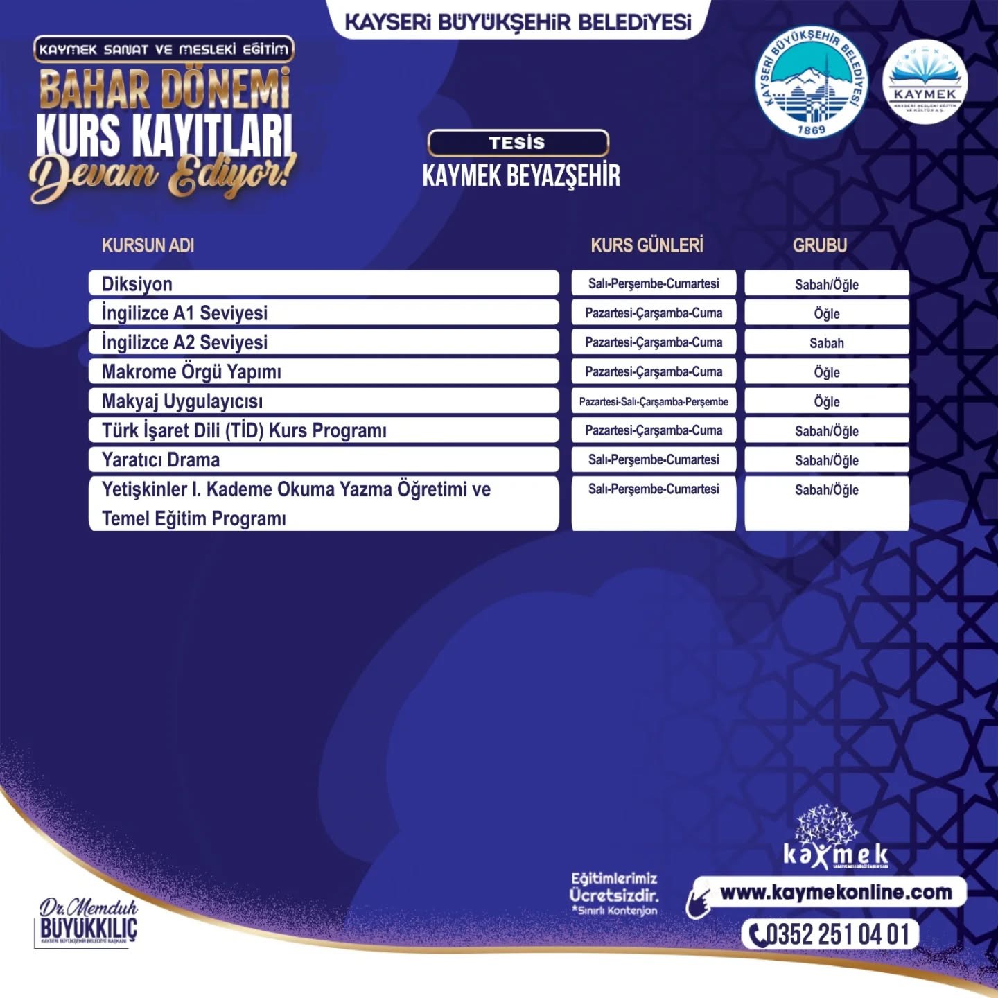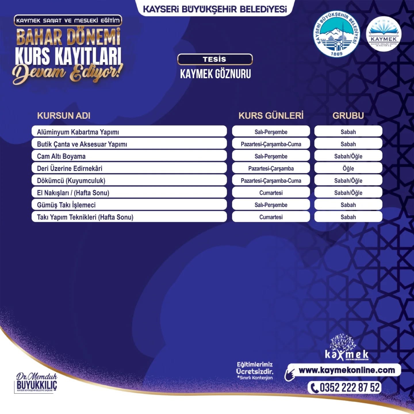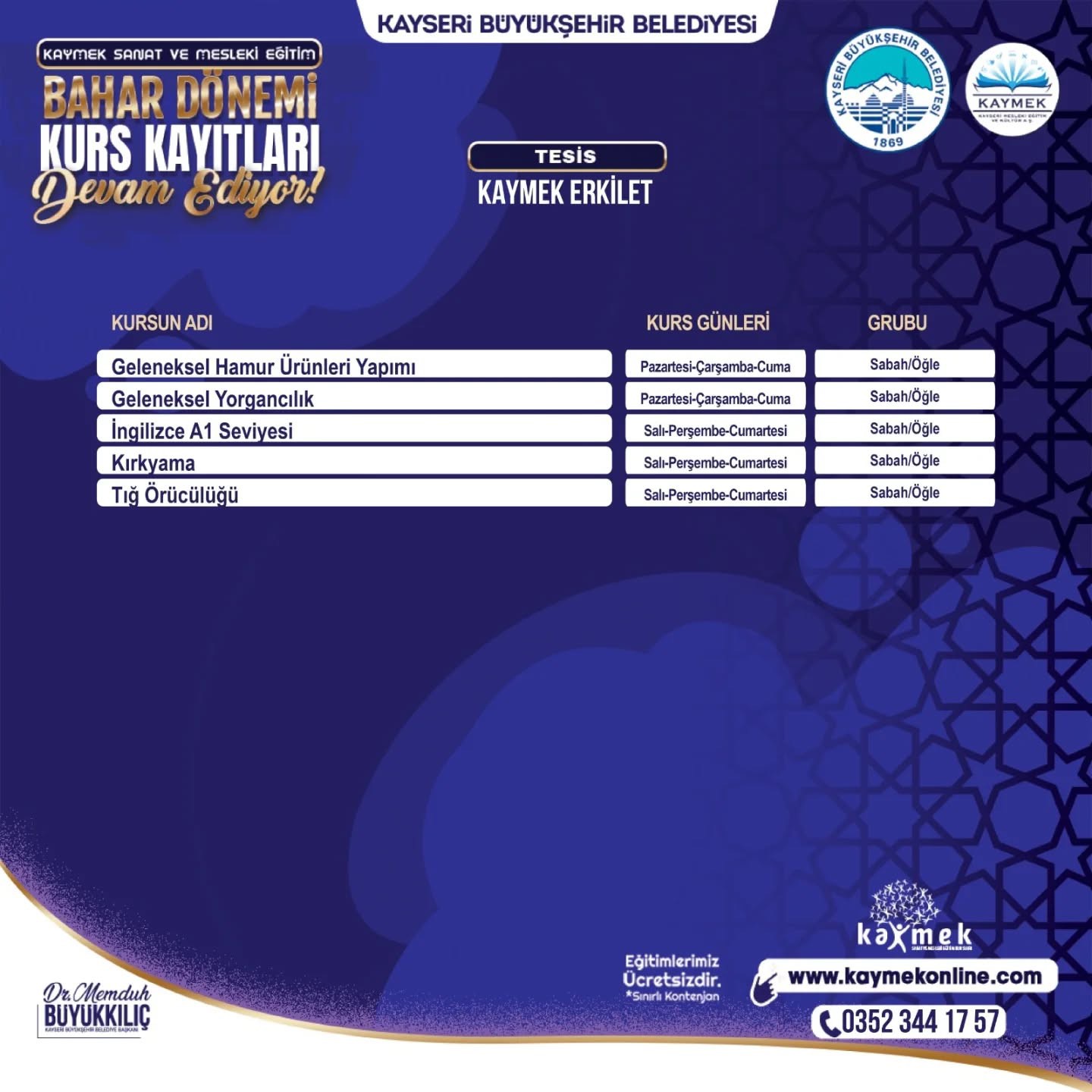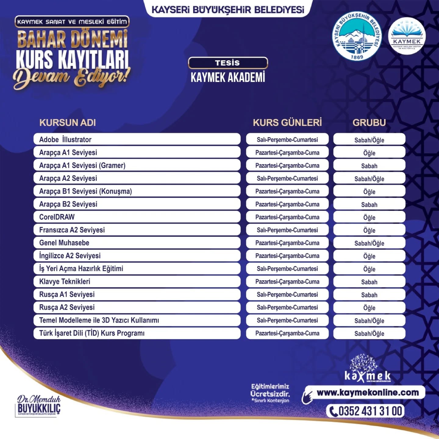 Kayseri’deki 6’ncı üniversite olarak faaliyet gösteren KAYMEK, yeni yılda da hizmetlerini hız kesmeden sürdürüyor. Bu çerçevede çocuklar ve gençler başta olmak üzere her yaş grubundan vatandaşa yönelik kaliteli ve zengin içeriklere sahip geniş yelpazedeki kurs çeşitliliği ile her yıl yüz binlerce insana dokunan KAYMEK’in 12 Ocak’ta başlattığı Sanat ve Mesleki Eğitim Bahar Dönemi kurs kayıtlarına müracaatları sürüyor. KAYMEK’in alanında uzman eğitmenleri tarafından tamamen ücretsiz olarak verilecek ve kontenjanları sınırları olan kurslar için kayıtlar www.kaymekonline.com internet adresi üzerinden gerçekleştirilebilecek. Kurslar hakkında detaylı bilgiye de bu internet adresi üzerinden ve 0 352 231 80 31 numaralı telefon üzerinden erişebilecek vatandaşlar, 1 Şubat 2026 tarihine kadar kayıt işlemlerini yapabilecek.
