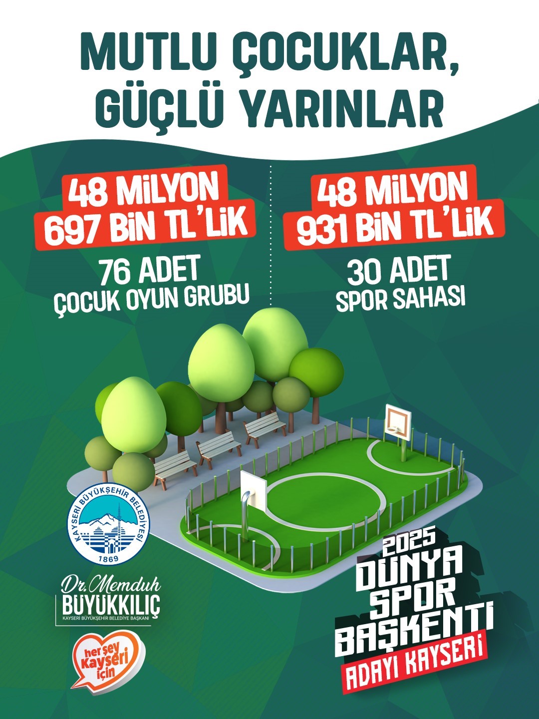 Kayseri Büyükşehir Belediyesi; 2025 yılında 106 proje ile çocukları ve gençleri sevindirdi. İhtiyaç duyulan ilçelerde 76 çocuk oyun alanı ve 30 spor sahası yapan Büyükşehir Belediyesi Kırsal Hizmetler Daire Başkanlığı; 97 milyon 628 bin TL’lik çocuk oyun grubu ve spor sahası yatırımı ile çocukları ve gençleri spora yönlendirdi.