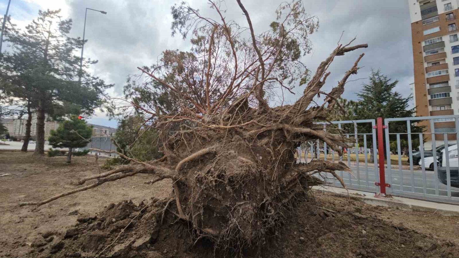 Kayseri’de etkili olan şiddetli rüzgar, refüjde bulunan bir ağacı kökünden söktü.