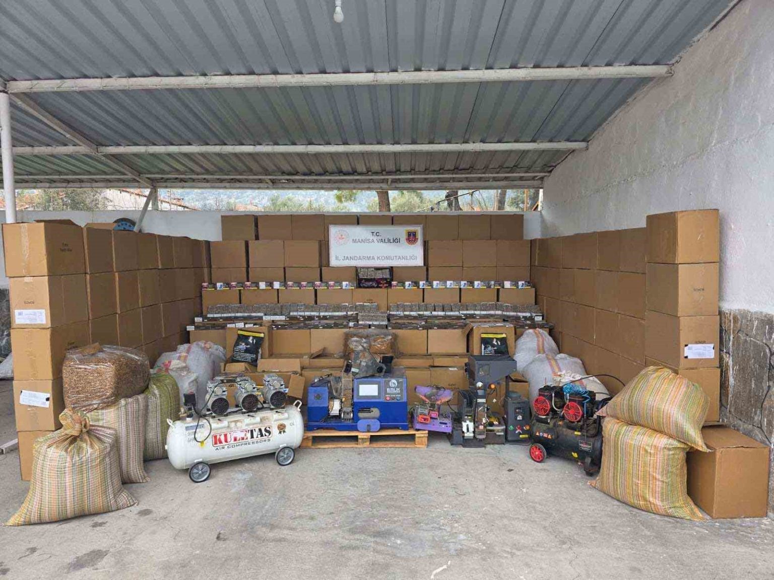 İl Jandarma Komutanlığı KOM Şube Müdürlüğü ekiplerince kaçakçılık suçlarıyla mücadele kapsamında 17 Mart’ta Kırkağaç ilçesinde H.T. isimli şahsa ait iş yeri, depo ve eklentilerinde arama yapıldı. Aramalarda 2 milyon 632 bin 600 adet boş makaron, 233 bin 160 adet içi tütün doldurulmuş sigara, 565 kilogram açık kıyılmış tütün, 3 adet elektronik sigara sarma makinesi ile 2 adet kompresör ele geçirildi.
