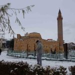 Medresenin mimarisiyle bütünleşen kış manzarası, kent merkezinde görsel bir şölen oluşturdu.