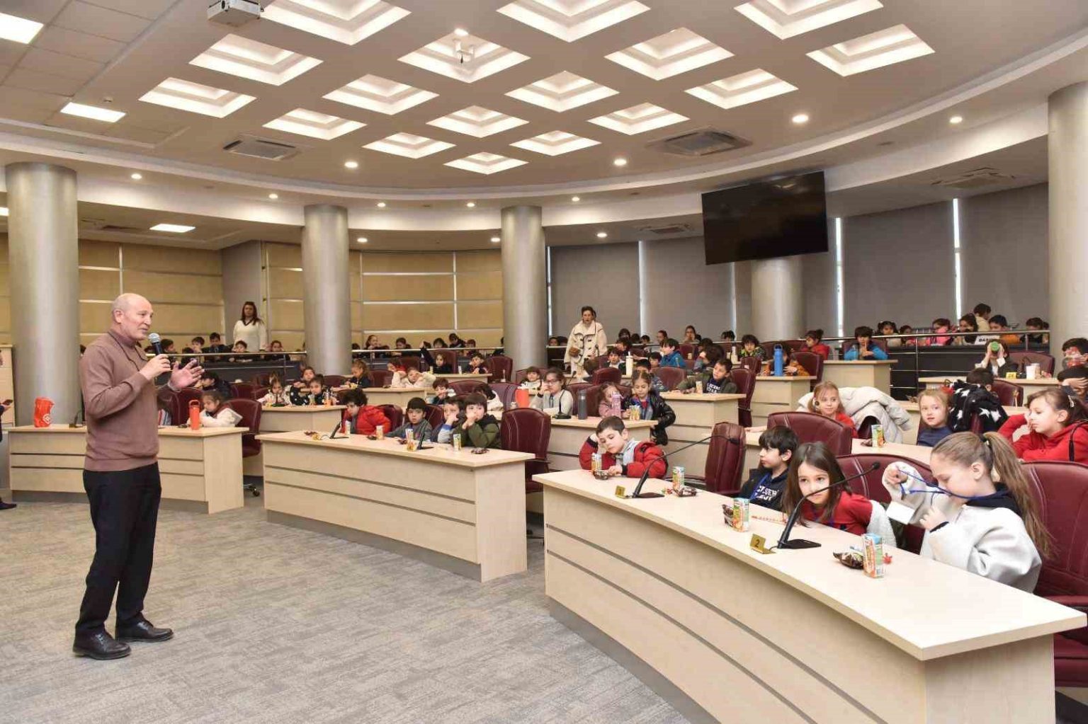 Ziyaret sonunda Başkan Kocagöz, öğrencilere meyve suyu ve kek ikramında bulunarak süslü kalemler hediye etti. Öğrenciler, daha sonra belediye meclis salonunu gezdi. Birim müdürleri, kendi çalışma alanları hakkında bilgi vererek, öğrencilerin sorularını yanıtladı.