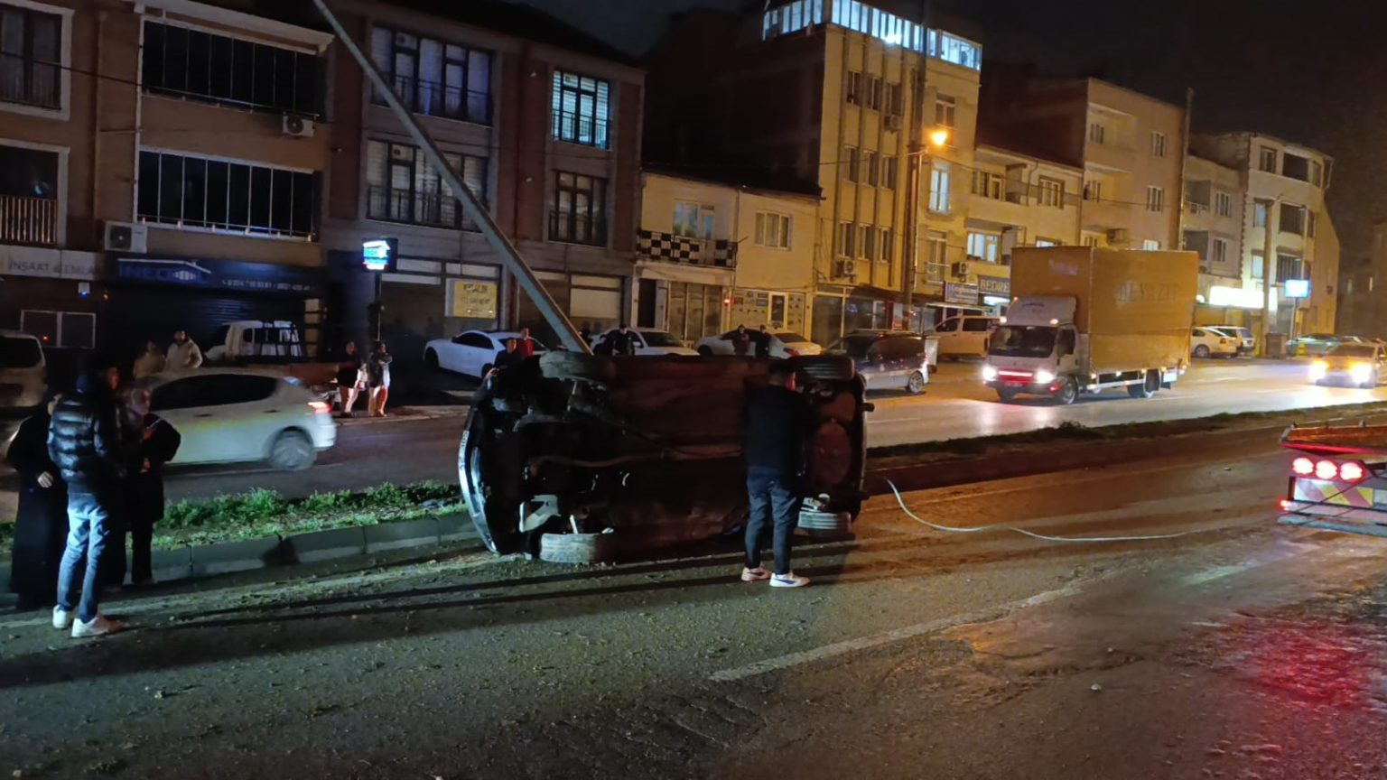 Bursa’nın İnegöl ilçesinde yağış nedeniyle kayganlaşan yolda kontrolden çıkan otomobilin takla atarak direğe çarıptığı kazada 3 kişi yaralandı.