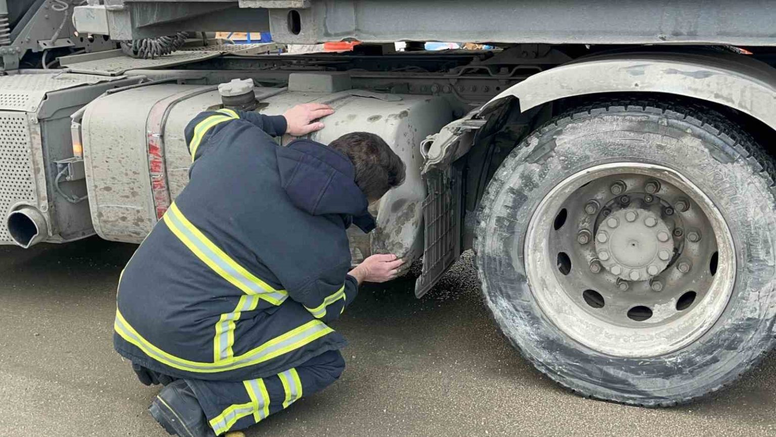 Eskişehir’de kayganlaşan yolda kontrolden çıkan otomobil park halindeki tıra çarptı. Çarpmanın etkisiyle tırın delinen deposu, çamurla kaplanarak mazot akışı kesildi.