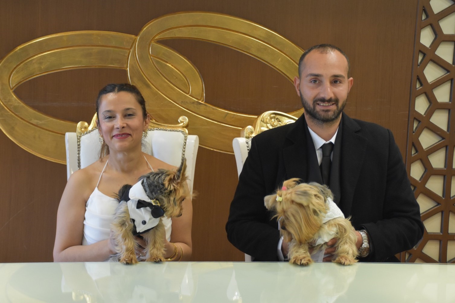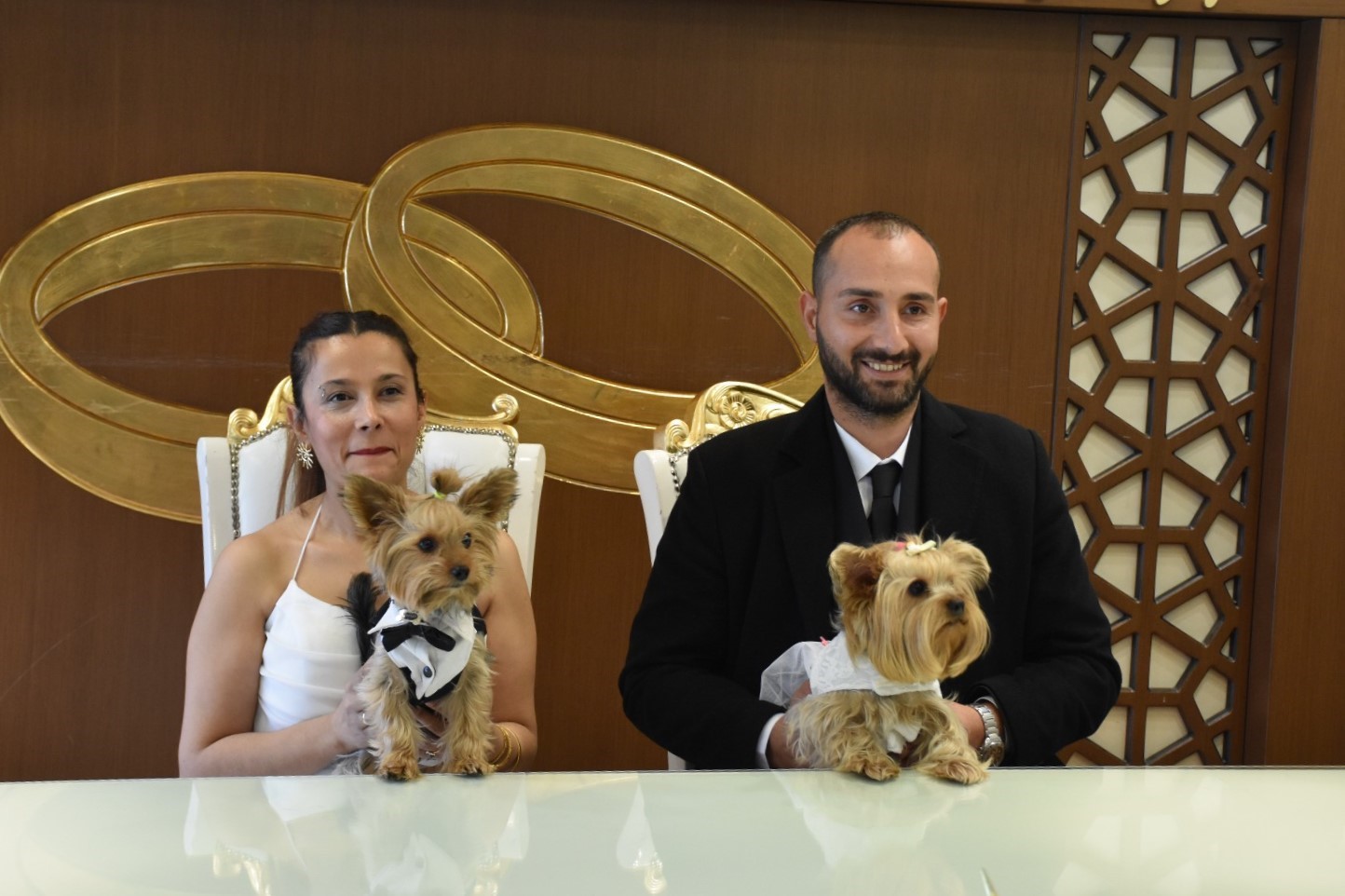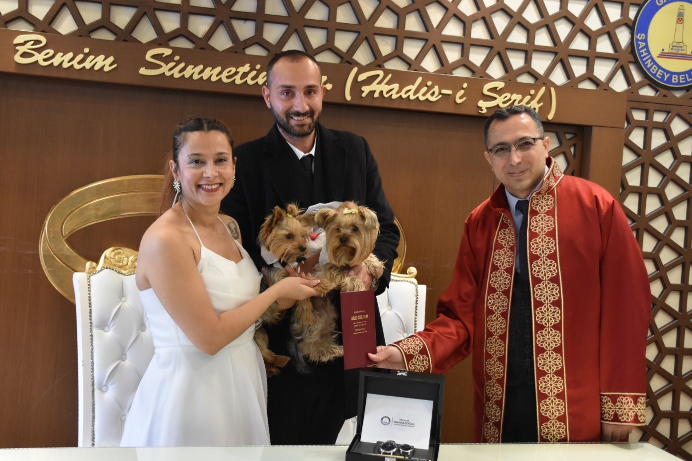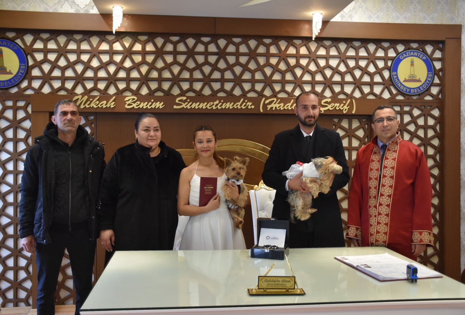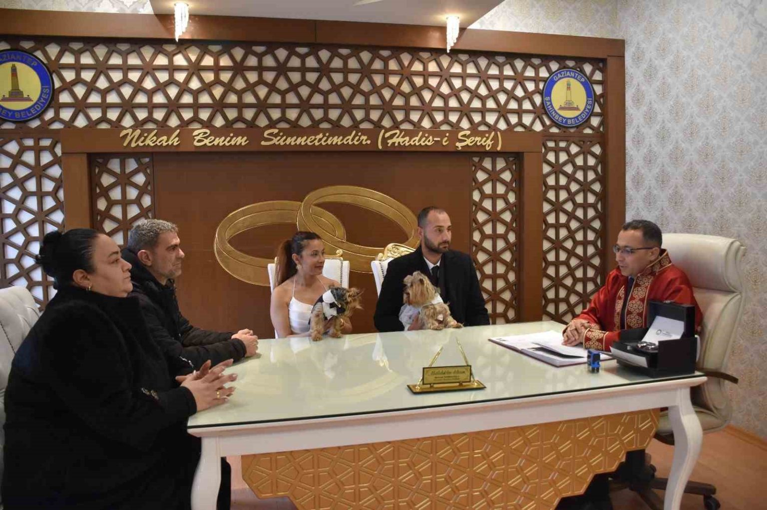 Hayatlarını birleştiren Dilek Öztürk ile Hakan Özbek, bugüne kadar benzerine rastlanmamış bir nikah töreni gerçekleştirdi. Nikah için Şahinbey Belediyesi Evlendirme Memurluğuna başvuran Dilek Öztürk ile Hakan Özbek, nikah salonuna gelinlik ve damatlık giydirdikleri Yorkshire teriyeri cinsi köpekleri ile geldi.