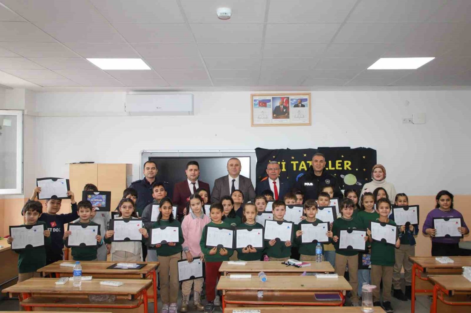 Aydın’ın Köşk ilçesinde yarı yıl tatiline giren 4 bin 349 öğrenci karne heyecanı yaşarken, Adnan Menderes İlkokulu öğrencileri karnelerini Kaymakam Hasan Taş’ın elinden aldı.