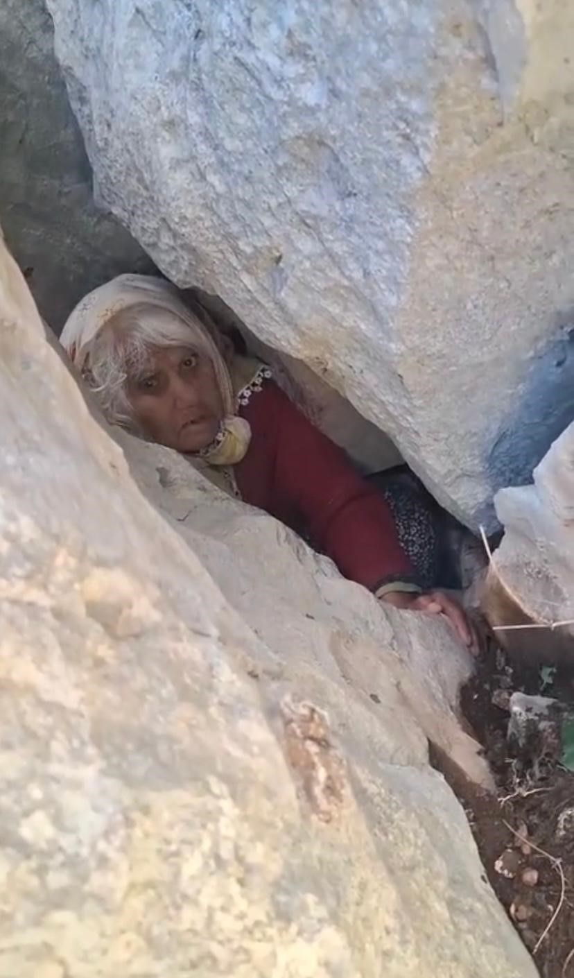 Antayla’nın Serik ilçesinde küçükbaş otlatmak için evinden çıkan ve geri dönmeyen yaşlı kadın yakınlarının ihbarı üzerine bir gün sonra kayalıkları arasındaki yaklaşık 5 metrelik yarıkta jandarma dronuyla yapılan taramada sıkışmış halde bulundu.