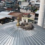 Kubbedeki leylekler mahalle yaşantısına renk katıyor