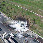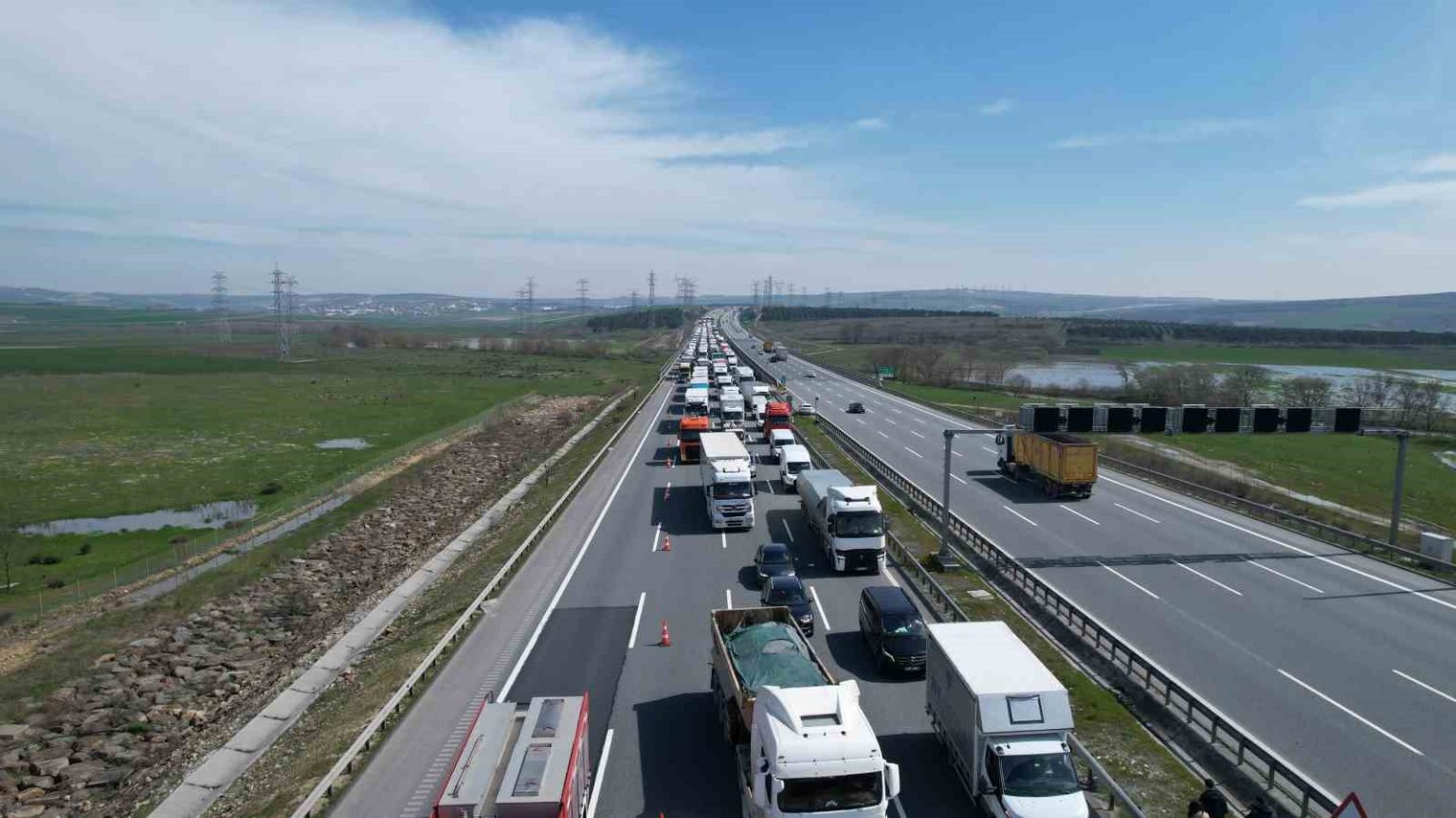 Oluşan trafik yoğunluğu ve yangının ardından kamyonun son hali dron kamerasıyla havadan görüntülendi.