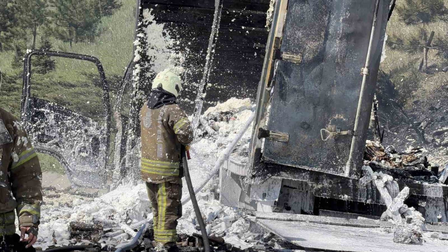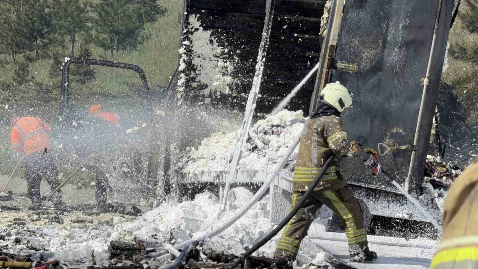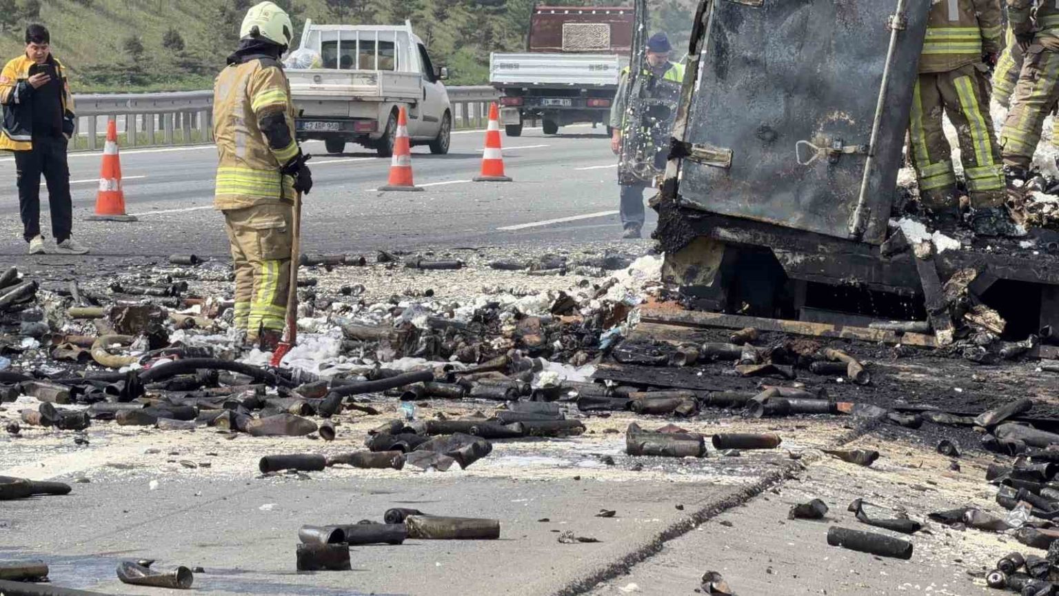 Kuzey Marmara Otoyolu’nda köpük sprey yüklü kamyon alev alev yandı