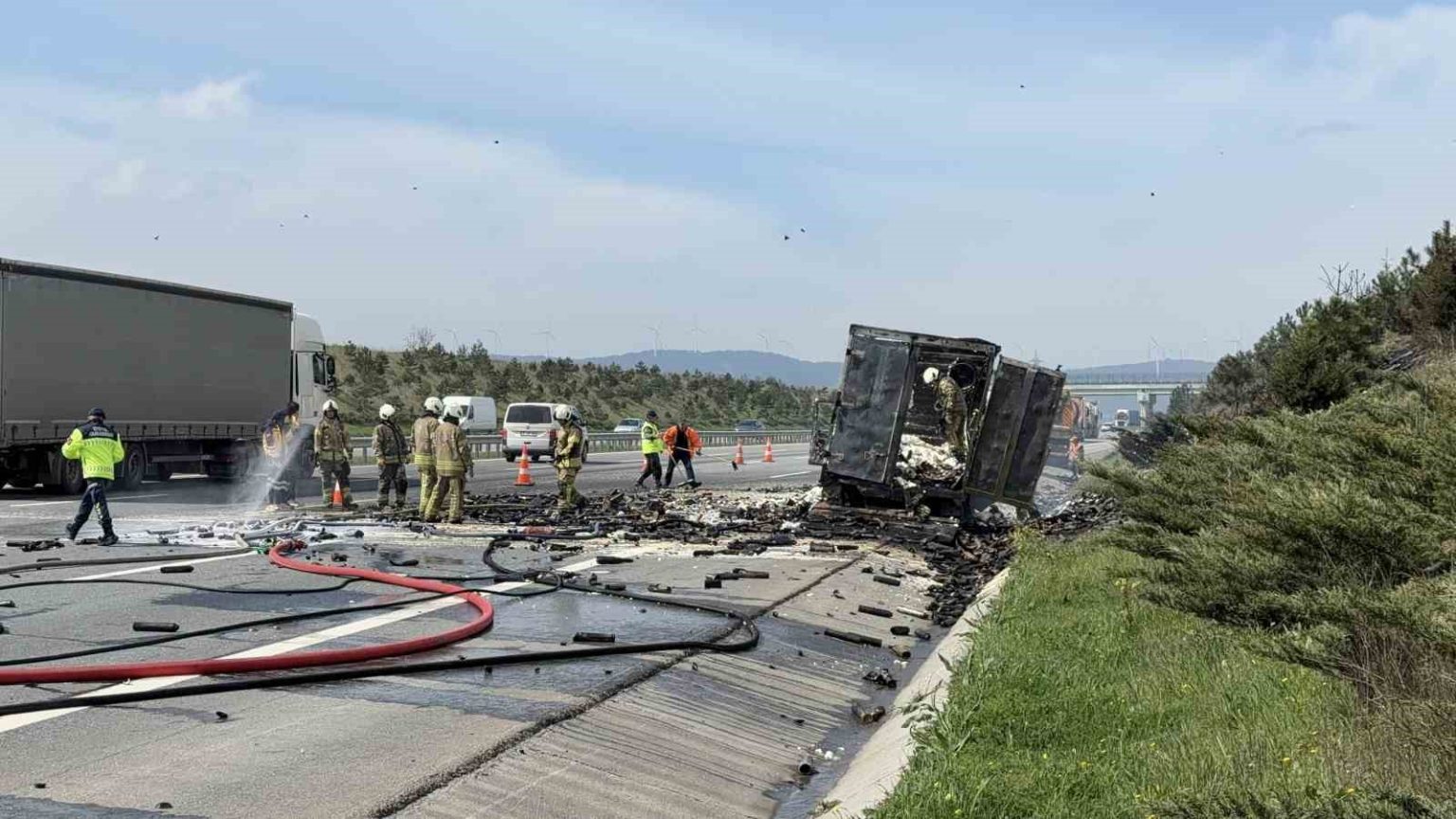 Olay, Kuzey Marmara Otoyolu’nun Çatalca ilçesi Nakkaş mevkiinde, Edirne istikametinde meydana geldi. Edinilen bilgilere göre, Pendik’ten hareket eden 34 HLL 359 plakalı köpük sprey yüklü kamyon, seyir halindeyken bilinmeyen bir nedenle yanmaya başladı. Kısa sürede büyüyen yangın sırasında kamyon kasasında bulunan inşaatlarda kullanılan köpük spreyler art arda patladı. Patlamaların etkisiyle spreyler metrelerce sağa sola savrulurken, o anlar çevredeki vatandaşlar tarafından cep telefonu kamerasıyla kaydedildi. İhbarlar üzerine bölgeye Arnavutköy, Çatalca ve Başakşehir ilçelerinden çok sayıda itfaiye ekibi sevk edildi. Yangın sonrası kamyon tamamen yanarak hurdaya dönerken, Kuzey Marmara Otoyolu’nun dört şeritli yolunun iki şeridi trafiğe kapandı. Kalan iki şeritten kontrollü olarak sağlanan trafik nedeniyle kilometrelerce araç kuyruğu oluştu.