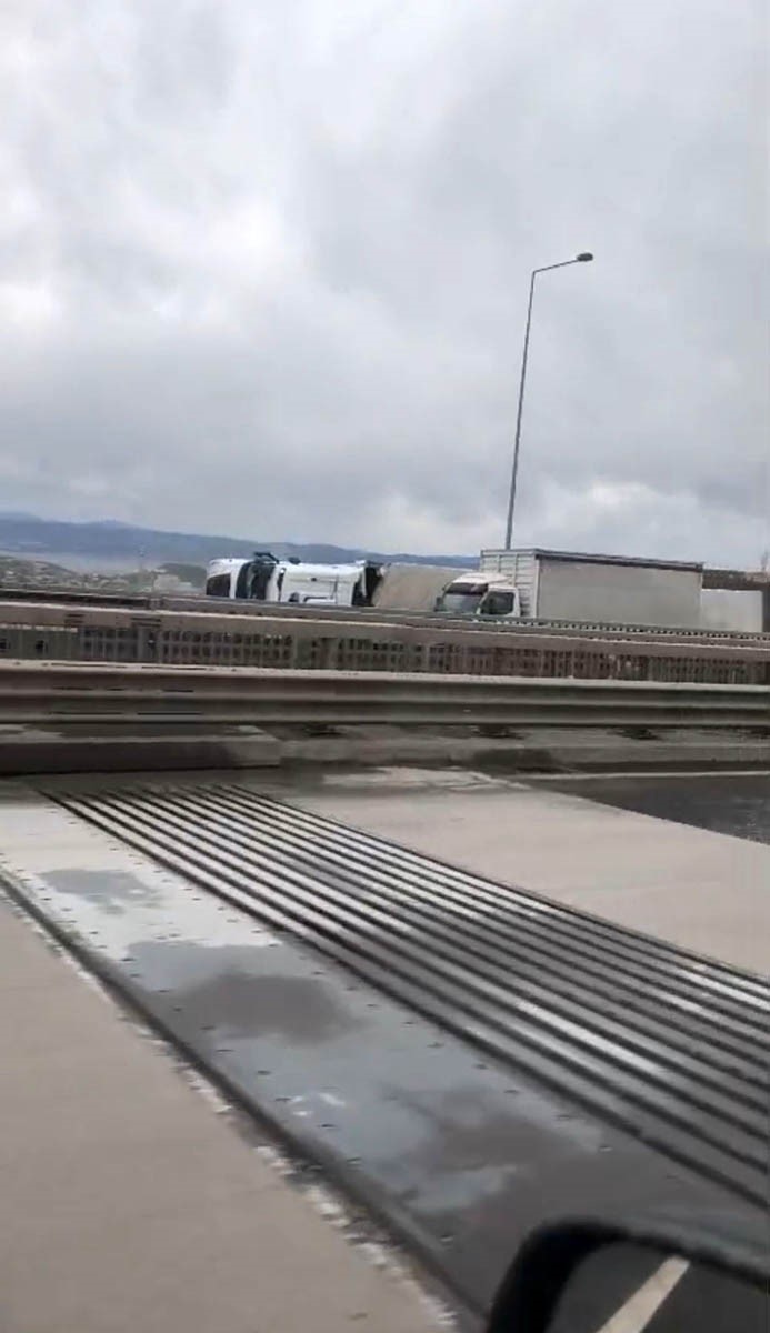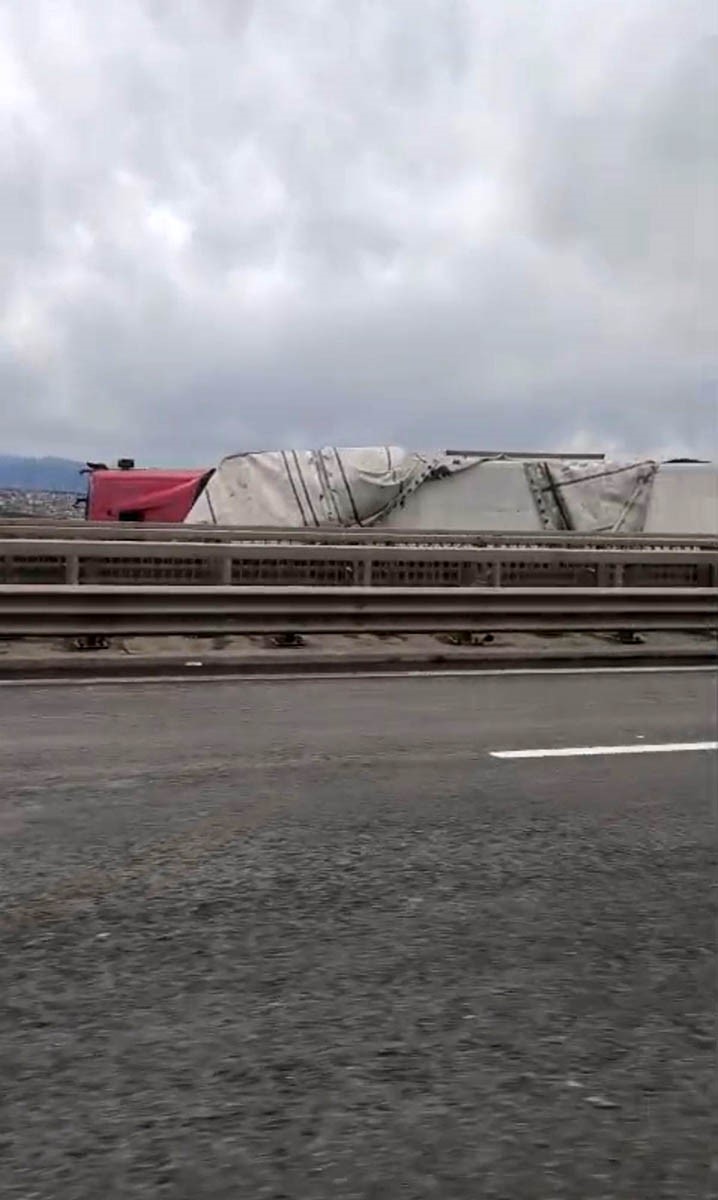 Kuzey Marmara Otoyolu’nun Kocaeli kesiminde etkili olan şiddetli fırtına nedeniyle seyir halindeki 2 tır devrildi.