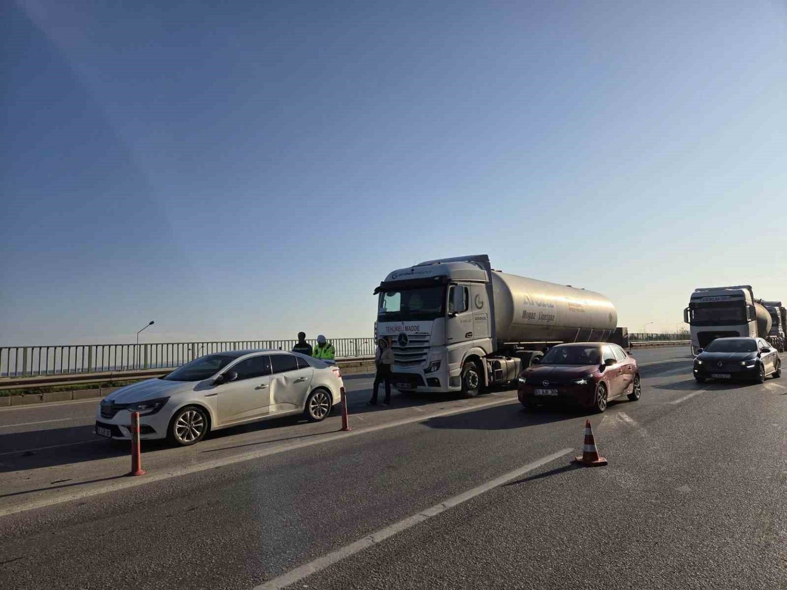 İlk kazanın ardından aynı yönde ilerleyen 34 HRC 88 plakalı çekici ile 34 NH 2295 dorse plakalı Aygaz marka LPG yüklü tanker, 55 AJM 187 plakalı otomobile yandan çarptı. Polis ekipleri, kazaların ardından güvenlik önlemi alarak 3 şeritli yolu tek şeride düşürdü. Trafikte yoğun araç kuyruğu oluşurken, LPG yüklü tankerin karıştığı kaza maddi hasarla atlatıldı.