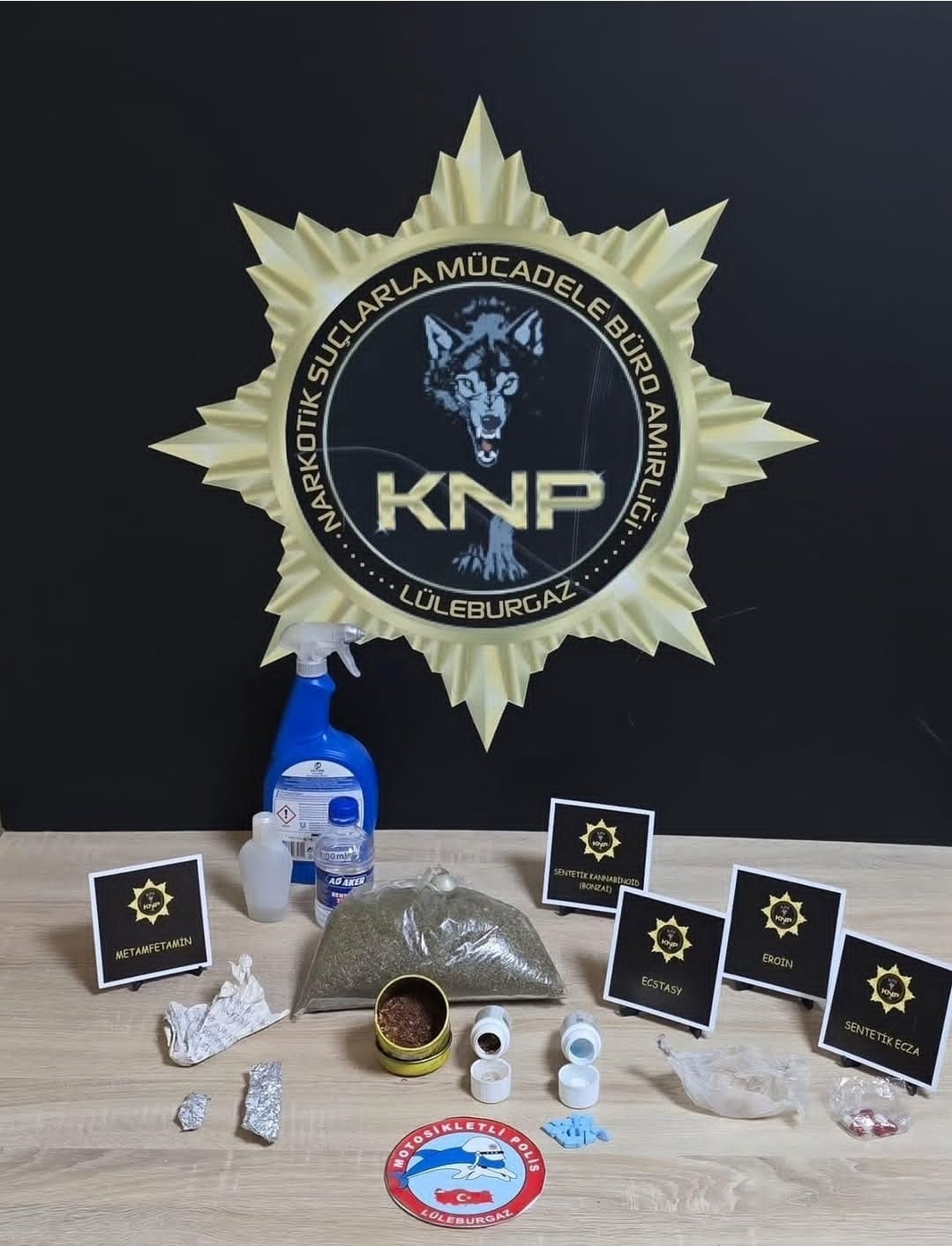 Edinilen bilgiye göre, Lüleburgaz İlçe Emniyet Müdürlüğü Narkotik Suçlarla Mücadele Şubesi ekipleri ile Yunus timleri tarafından bir ikamete operasyon düzenlendi. Yapılan aramalarda 343,08 gram sentetik kannabinoid (bonzai), 22,59 gram eroin, 18,76 gram metamfetamin, 18 adet ekstasy hap, 6 adet sentetik ecza ile uyuşturucu madde üretiminde kullanılan kimyasal maddeler ele geçirildi.