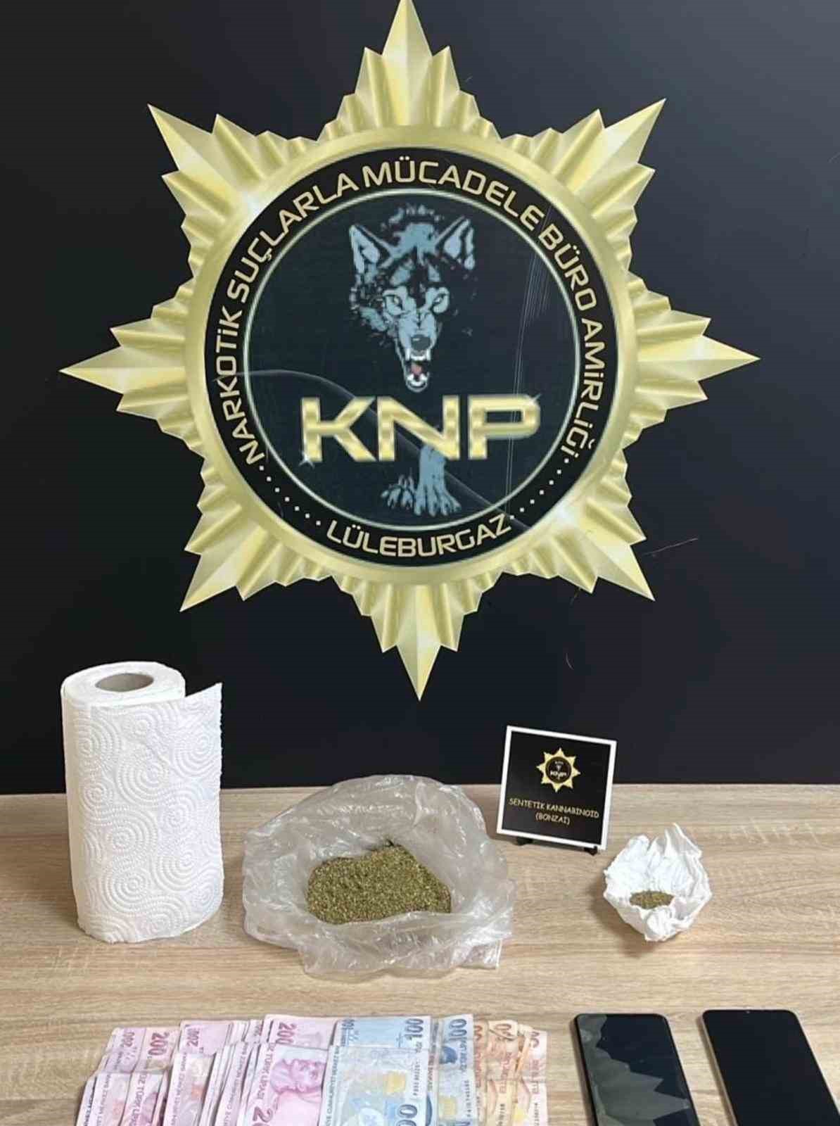 Edinilen bilgilere göre, Kırklareli Emniyet Müdürlüğü Narkotik Suçlarla Mücadele Şubesi ekipleri tarafından Lüleburgaz ilçesinde bir ikamete yönelik arama yapıldı. Yapılan aramada 64,28 gram sentetik kannabinoid (bonzai) ile suçtan elde edildiği değerlendirilen 4 bin 250 TL ele geçirildi. Olayla ilgili gözaltına alınan 2 şüpheli, emniyetteki işlemlerinin ardından adli mercilere sevk edildi. Mahkemeye çıkarılan 2 kişi tutuklanarak cezaevine gönderildi.