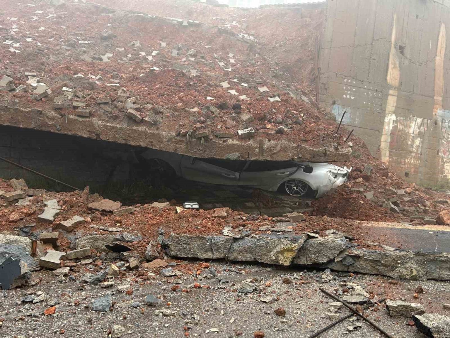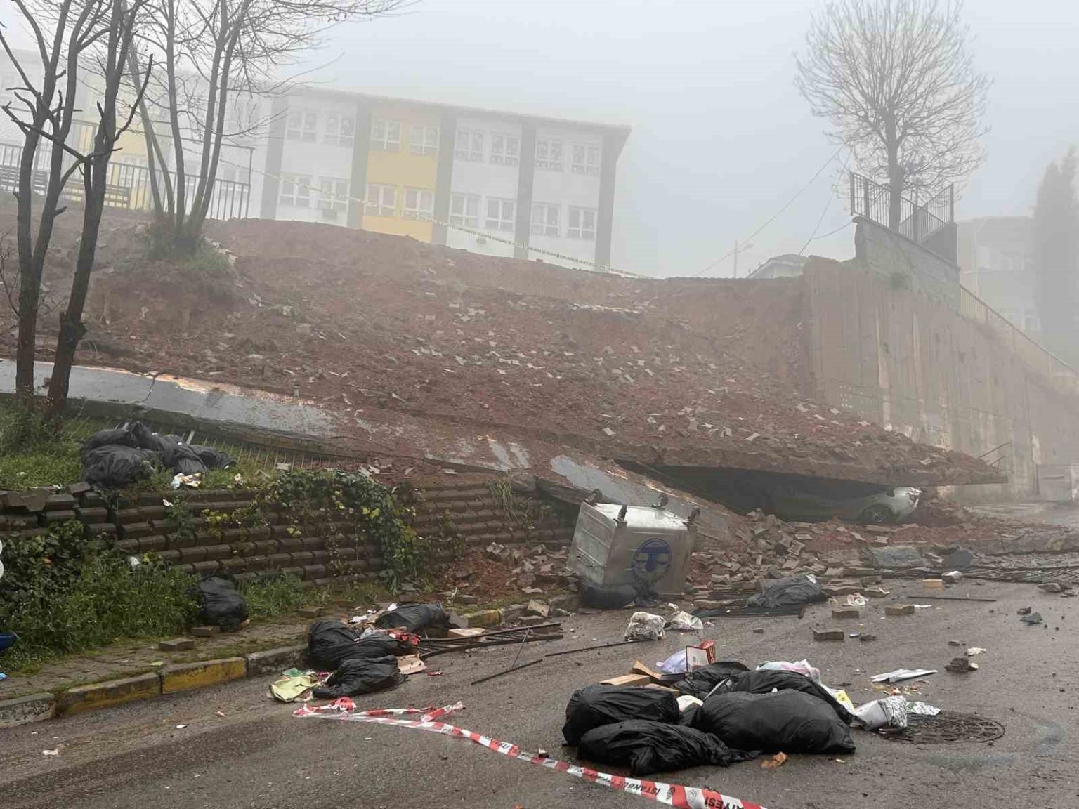 Maltepe’de okulun istinat duvarı çöktü: Araç kullanılamaz hale geldi