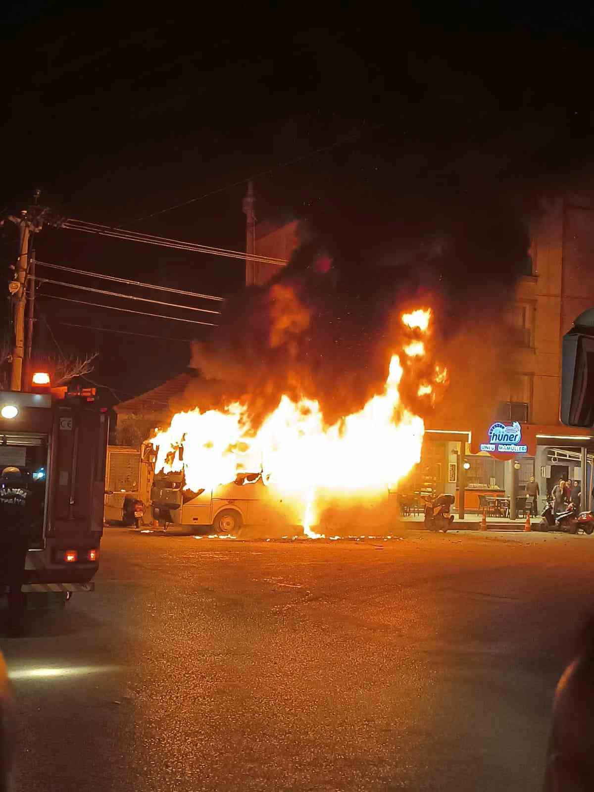 Manisa’nın Turgutlu ilçesinde işçi servisi olarak kullanılan bir otobüs, işçileri almaya gitmek üzereyken alev aldı. Otobüsün boş olması facianın önüne geçerken, yangında çevrede bulunan 4 motosiklet de hasar gördü.