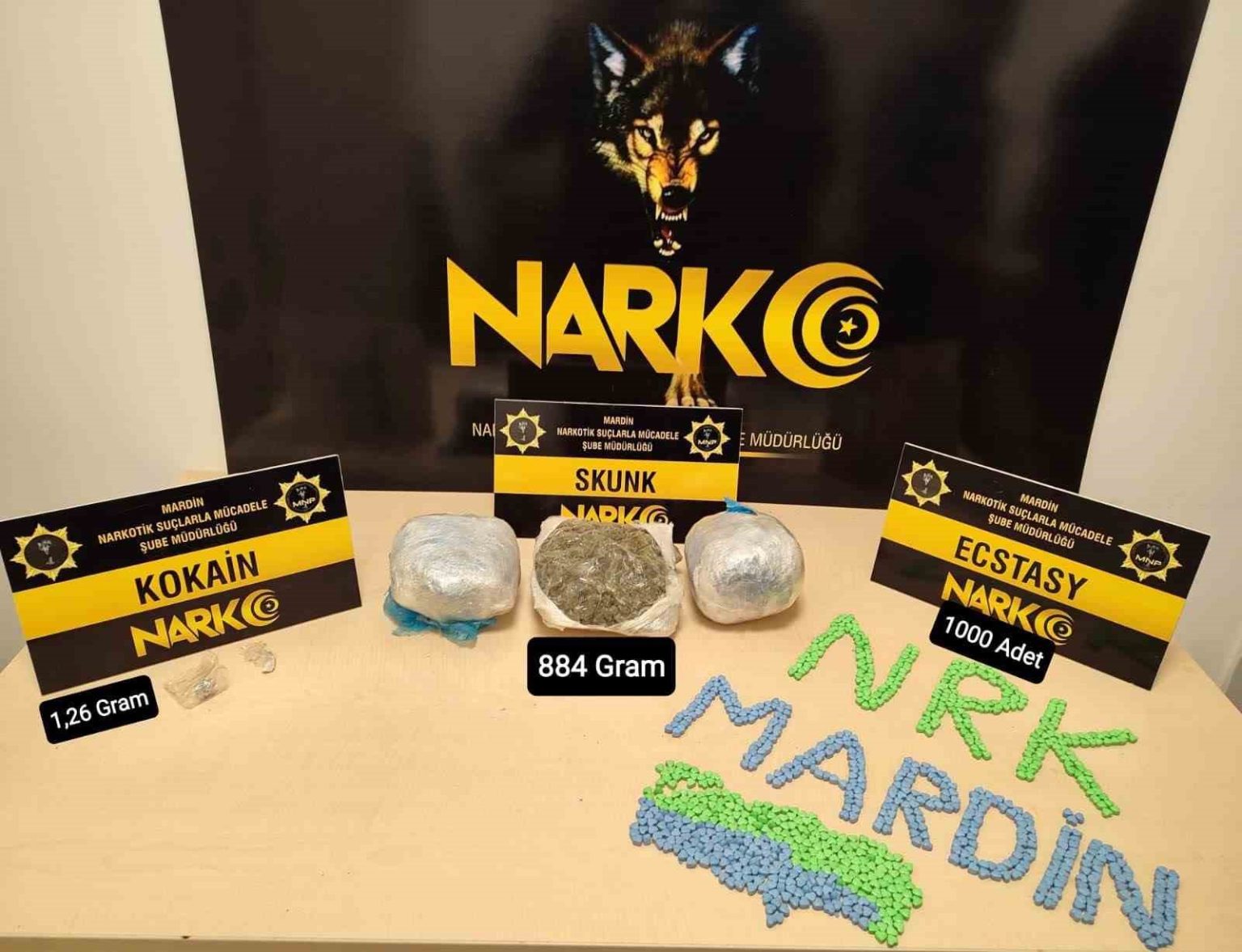 İl Emniyet Müdürlüğünden NSosyal medya hesabından yapılan açıklamaya göre, Narkotik Suçlarla Mücadele Şube Müdürlüğü ekipleri uyuşturucu madde ticareti ve kullanımının önlenmesine yönelik çalışma yürüttü. Bu kapsamda Artuklu ilçesinde durdurulan iki araçta yapılan aramalarda 1000 adet ecstasy hap, 884 gram skunk ve 1,26 gram kokain ele geçirildi. Operasyonda yakalanan 4 şüpheli hakkında adli işlem başlatıldı.