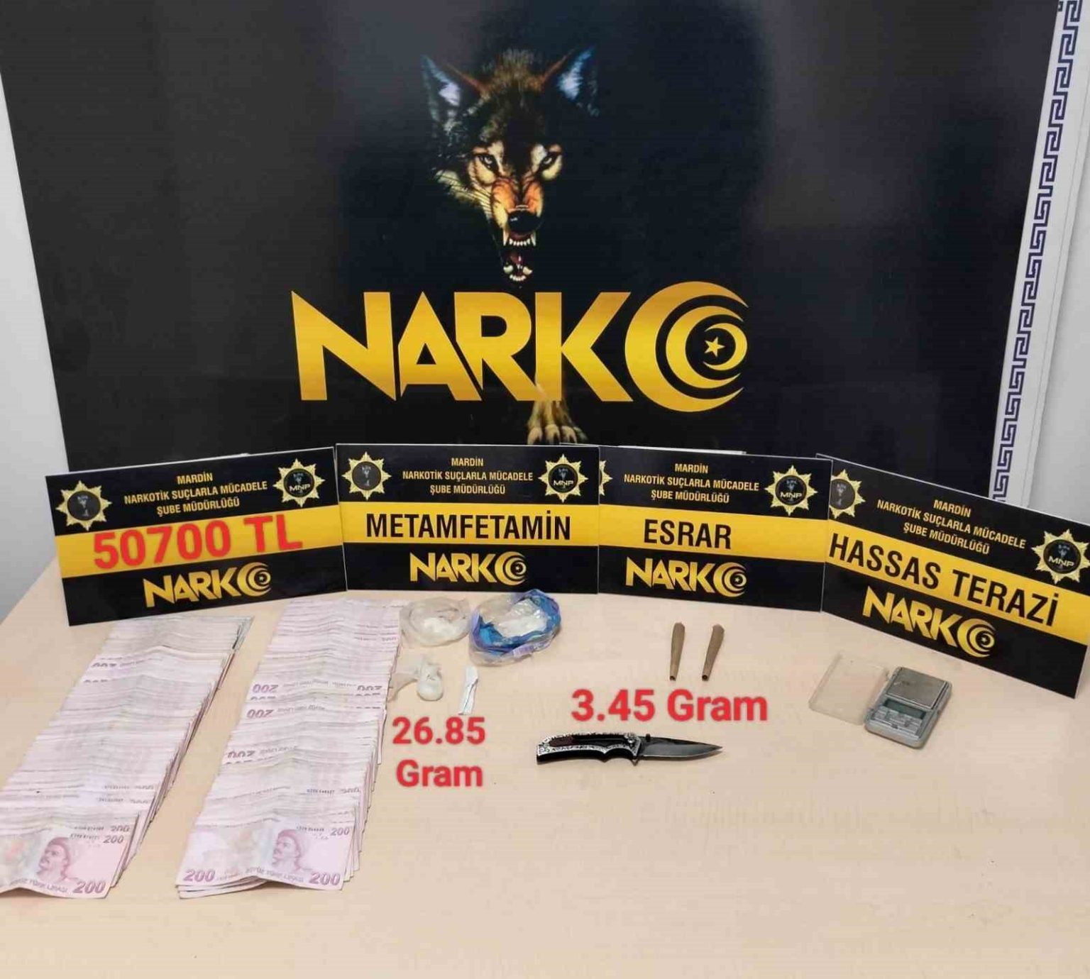 Mardin Emniyet Müdürlüğü Narkotik Suçlarla Mücadele Şube Müdürlüğü ekiplerince, uyuşturucu madde ticareti ve kullanımının önlenmesine yönelik Artuklu ilçesinde çalışma gerçekleştirildi. Yapılan operasyonlarda 26,85 gram metamfetamin, 3,45 gram esrar, 1 hassas terazi ile 1 kesici-delici alet ele geçirildi. Ayrıca uyuşturucu madde ticaretinden elde edildiği değerlendirilen 50 bin 700 lira nakit paraya el konuldu. Operasyonda yakalanan 3 şüpheli gözaltına alınırken, haklarında adli işlem başlatıldı.