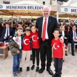 Türkiye Büyük Millet Meclisi’nin açılışının yıl dönümü olan ve Ulu Önder Gazi Mustafa Kemal Atatürk’ün çocuklara armağan ettiği 23 Nisan Ulusal Egemenlik ve Çocuk Bayramı, her yıl olduğu gibi bu yıl da Menemen’de coşkuyla kutlandı. Günün ilk programında Menemen Belediye Başkanlığı makamında geleneksel koltuk devri gerçekleşti. Tevfik Fikret İlkokulu 4. sınıf öğrencisi Envar Selcan başkanlık koltuğuna oturdu. Minik başkan, resim sanatına ilgi duyduğunu ifade ederek sanatsever bir başkan olarak takdir topladı. Menemen Belediye Başkanı Aydın Pehlivan ise Menemen Belediyesi olarak yapılan eğitim yatırımları ve çocuk odaklı hizmetleri dile getirdi. Başkan Aydın Pehlivan, “MEBGEM’den dijital eğitim paketlerine, Türkiye’nin en büyük tematik çocuk oyun köyünden açık ve kapalı olimpik yüzme havuzlarına, ücretsiz kültür, sanat ve spor kurslarından öğrencilere kırtasiye yardımlarına kadar evlatlarımıza tüm imkanlarımızla hizmet sunmaktan, eğitimi kırmızı çizgimiz olarak en önde tutmaktan onur duyuyoruz.” dedi.