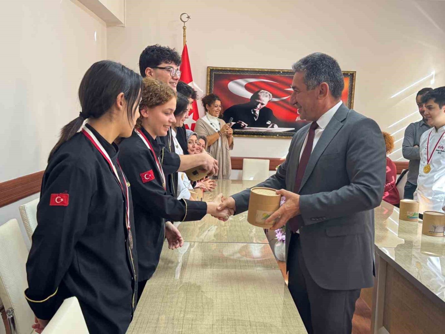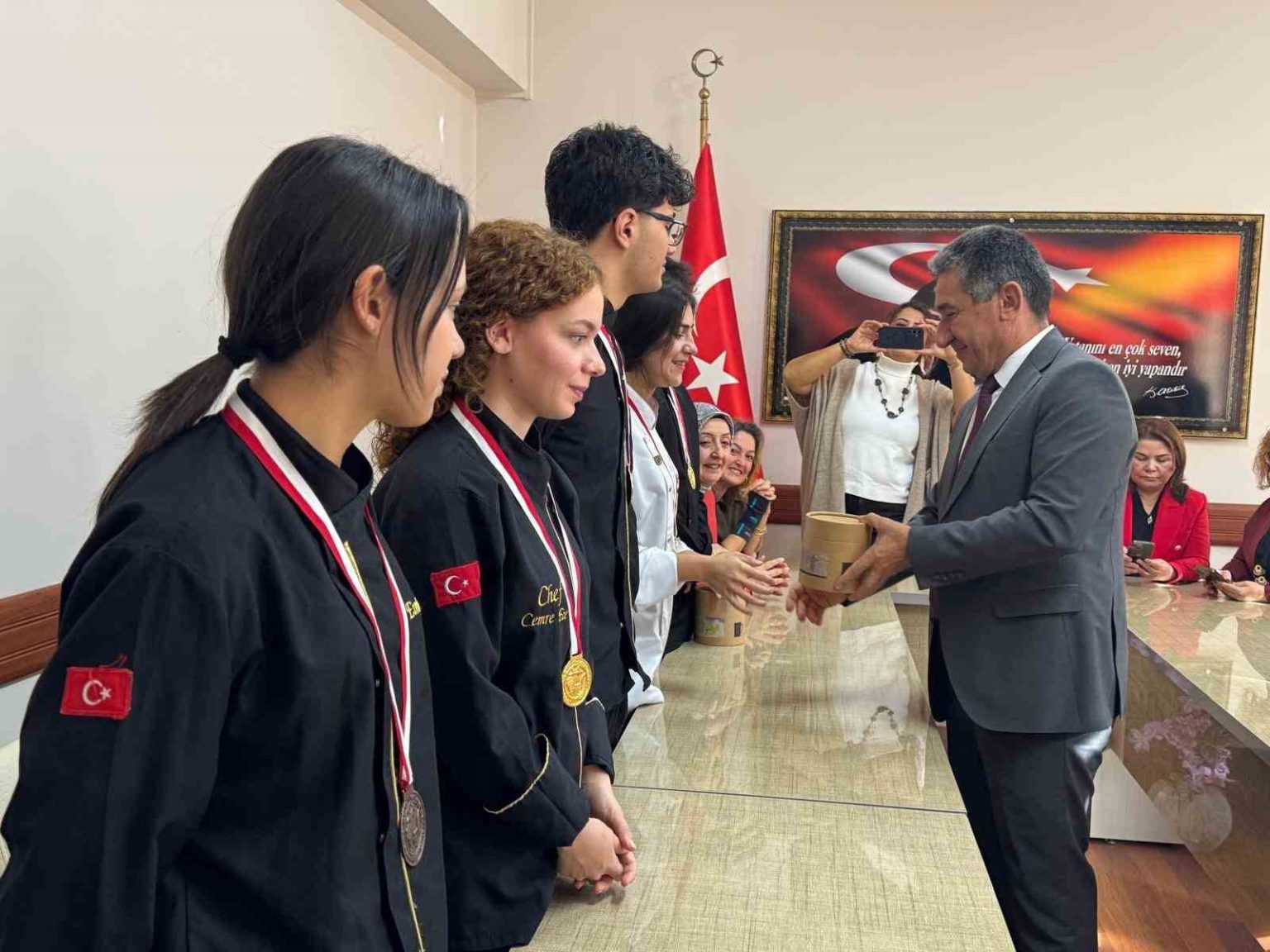 Menteşe İlçe Milli Eğitim Müdürü İdris Kömürcü, 22. Uluslararası İstanbul Mutfak Günleri Festivali kapsamında düzenlenen Gastrofest Yemek Yarışması’nda üstün başarı gösteren öğrencilerle bir araya geldi. Yarışmada 8 altın ve 3 bronz madalya kazanarak Muğla’nın gururu olan genç şefler, başarılarını İlçe Milli Eğitim Müdürü ile paylaştı.