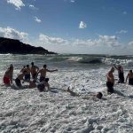 Mersin’in Bozyazı ilçesinde her yıl olduğu gibi bu sene de geleneği sürdüren yöre sakinleri 2026 yılının ilk gününde etkili olan rüzgar ve dalgalara rağmen denize girdi. Temsili Nasreddin Hoca ise denize ’tutarsa yoğurt, tutmazsa tuzlu ayran’ olur diyerek yoğurt mayaladı.