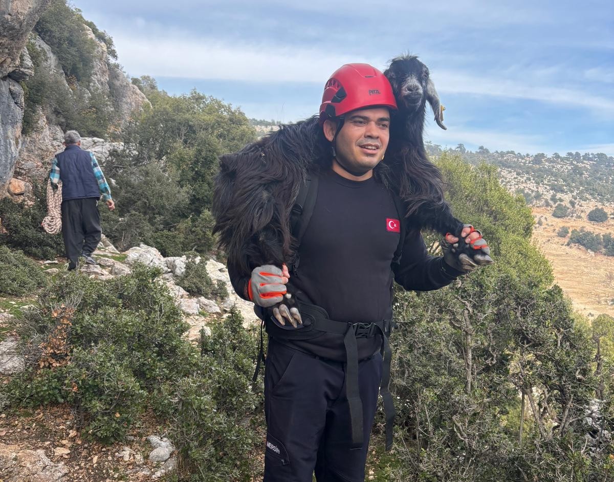 Mersin’de kayalıklarda mahsur kalan 2 keçi, itfaiye ekiplerinin kontrollü çalışmasıyla kurtarıldı.