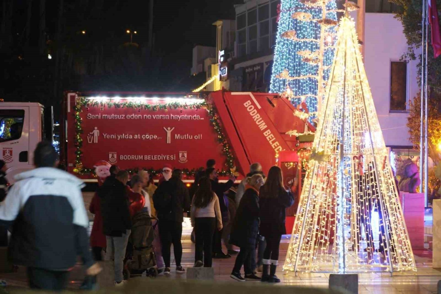 Bodrum Belediye Meydanı’nda, Bodrum Belediyesi ile birlikte Muğla Büyükşehir Belediyesi de sorumluluk alanında kalan bölümde bu sene daha farklı ve yoğun bir süsleme ile ışıklandırma kullandı. Işıklandırmaların yanında 2026 Yılbaşı Pazarı ile birlikte Bodrum Belediye Meydanı’ndan Barış (İskele) Meydanı’na kadar uzanan alan, 2025’ten 2026’ya geçilen anlarda yoğun kalabalığa sahne oldu. Yeni yıla özel olarak giydirilen çöp kamyonu da vatandaşların ilgisini çekti. Üzerinde “Seni mutsuz eden ne varsa hayatında Yeni yılda at çöpe mutlu ol” yazısıyla dikkat çeken çöp kamyonu ve Noel Baba kıyafeti giymiş personellerle birlikte meydanın her köşesinde fotoğraf çektiren binlerce vatandaş, bu anları sosyal medya hesaplarından paylaşarak yeni yılı Bodrum merkezinde karşıladı.