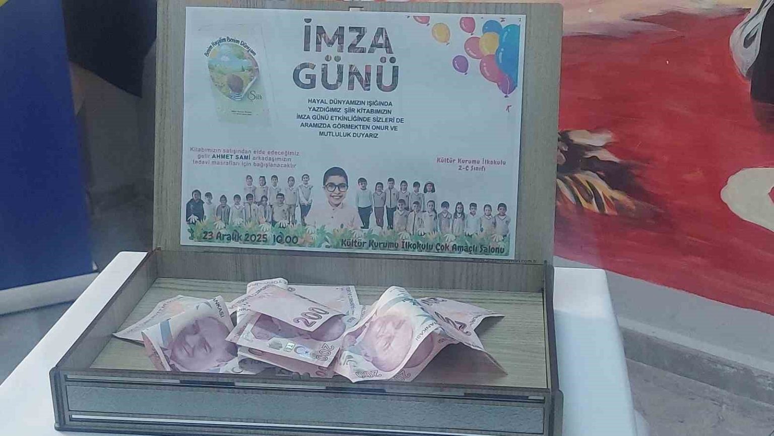 Erzurum’un Yakutiye İlçesi Kültür Kurumu İlkokulu 2-C sınıfı öğrencileri, öğretmenleri Sunay Cankesen ve ailelerinin desteği ile “Benim Hayalim Benim Dünyam” isimli bir şiir kitabı çıkardılar. 26 minik yürek baskısı yapılan 32 sayfalık kitabın tanıtımı ve imza günü için bir araya geldi. Okul salonundaki imza gününe Yakutiye İlçe Milli Eğitim Müdürü Abdurrahman Gazioğlu, okul öğretmen ve yöneticileri ile veliler katıldı. Satışı yapılan her bir kitabı imzalayan çocuklar elde edilen geliri arkadaşlarının tedavisine bağışlayarak örnek davranış sergiledi. Kültür Kurumu İlkokulu 2-C sınıfı öğretmeni Sunay Cankesen, ortaya çıkan eserin bir çok manada değerli ve anlamlı olduğunu ifade ederek, “Çocuklarım hem şiiri kitabı çıkardı hem tedavisi devam eden arkadaşlarına az da olsa destek oldular. Onlarla gurur duyuyorum” diye konuştu.