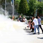 Elektrik yangınlarında hem yangını kontrol altına alabilmek hem de elektrikli cihazları koruyabilmek adına özel geliştirilmiş yangın tüplerinin de belediyenin çeşitli noktalarında yer aldığını belirten Savaş, oluşabilecek bir yangın anında rüzgarın arkaya alınarak 45 derecelik sporcu duruşu açısıyla yangına müdahale edilmesi gerektiğini vurguladı. Verilen bilgilerin ardından gönüllü personel, Acil Toplanma Noktası’nda oluşturulan yapay yangına yangın tüpleri ile müdahalede bulunarak uygulamalı yangın söndürme deneyimi yaşadı.