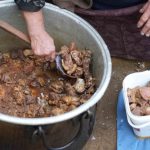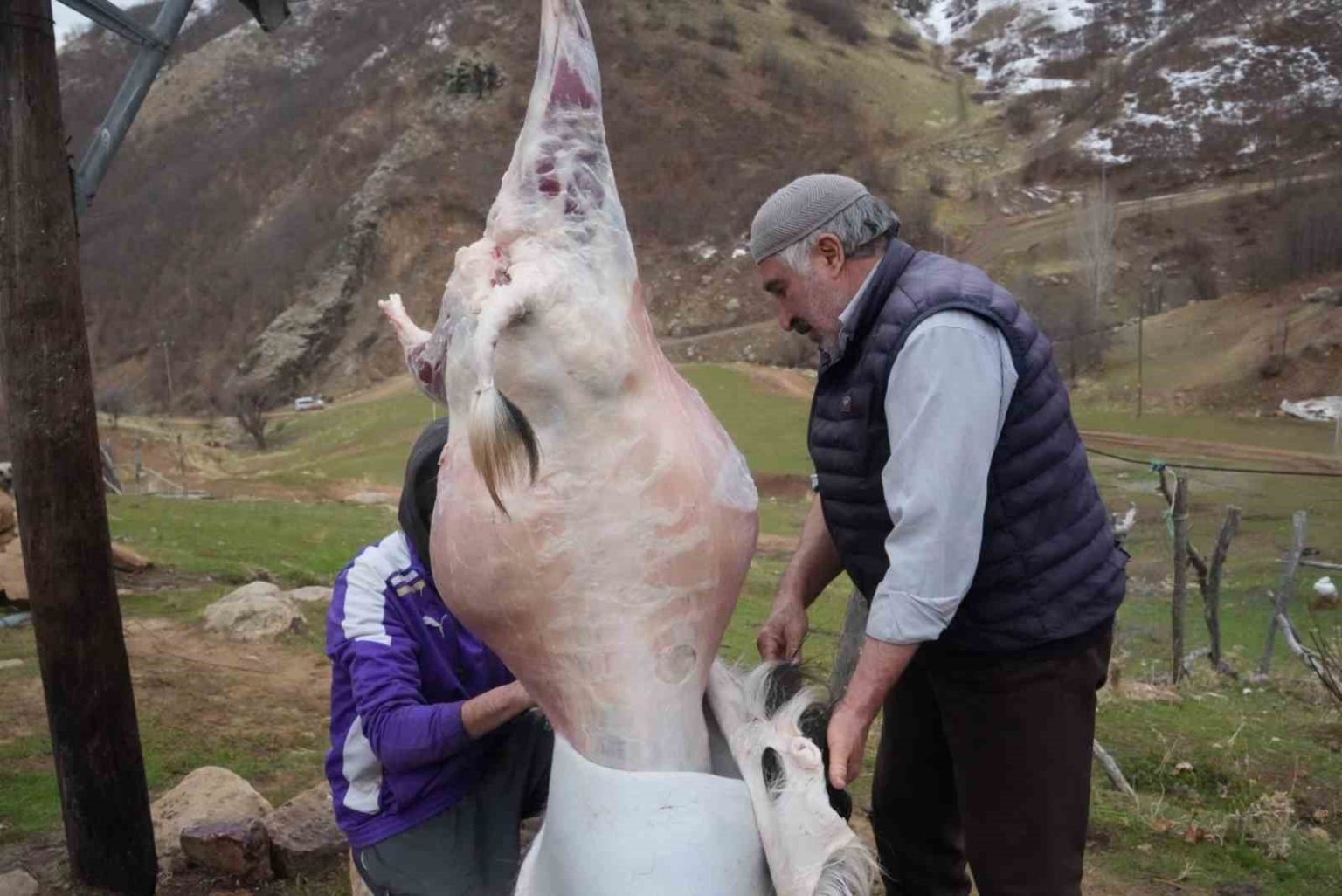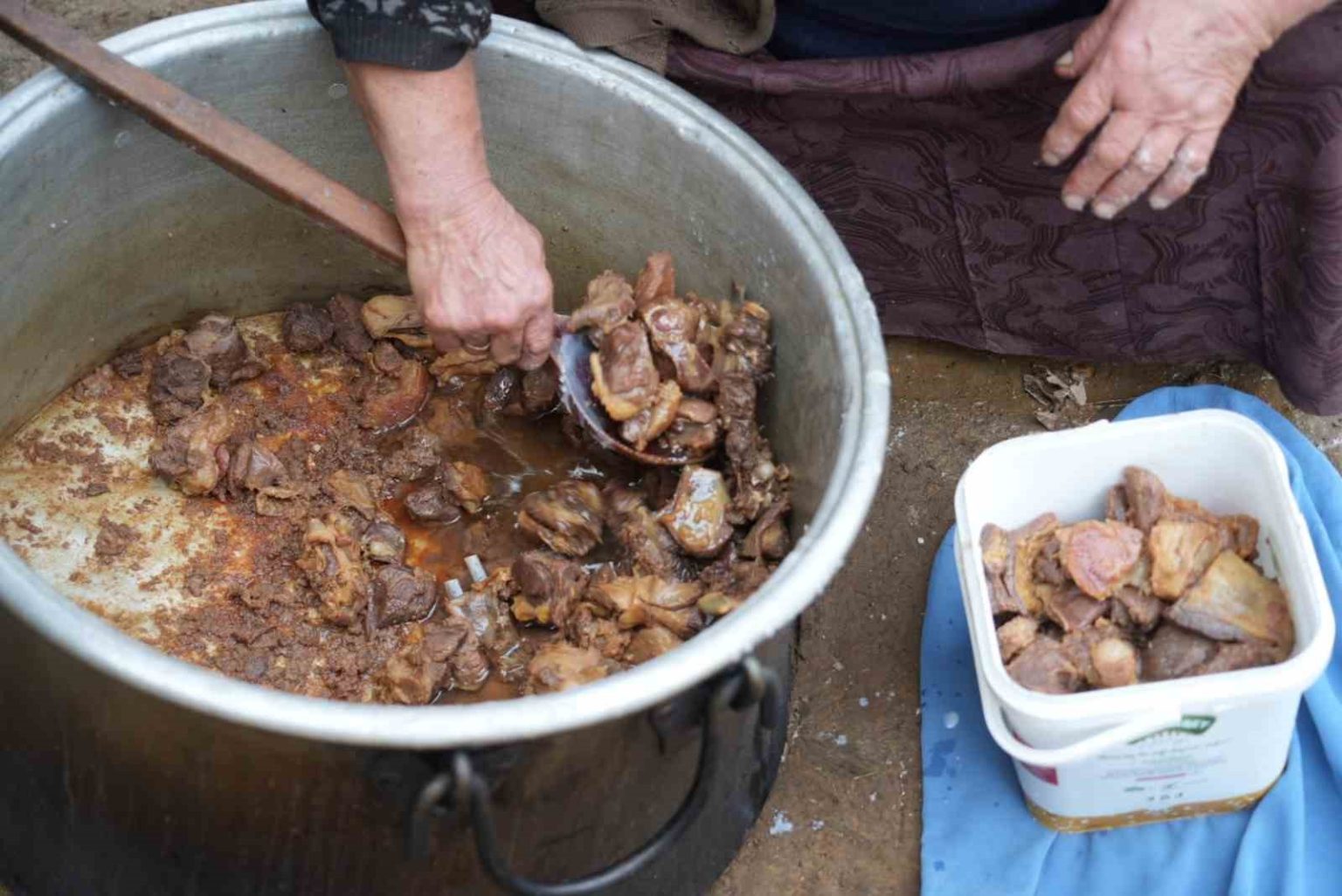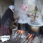 Muş’un Karabey köyünde vatandaşlar, kış aylarında tüketmek üzere meşe ateşinde geleneksel yöntemlerle kavurma hazırlıyor.