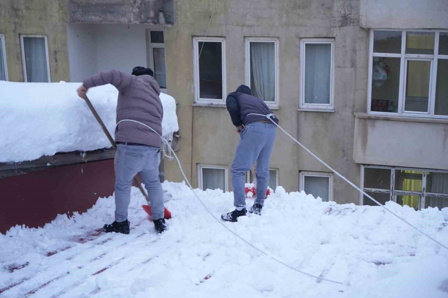 Yıllardır çatılara çıkıp çatı temizliği yaptığını söyleyen İbrahim Demirel de güvenliklerini halatlarla sağladıklarını söyleyerek, “Kar yağışı nedeniyle çatılarda çok kar birikiyor. İnsanların başına düşüyor. Bundan dolayı çatıları temizliyoruz. Çatılardan vatandaşların ve araçların üstüne kar düşmesin. Halatın bir ucunu bacalara ya da çatının içinde ağaçlara bağlıyoruz ya da arkadaşımız tutuyor, diğer ucunu ise kendimize bağlıyoruz. Başta korkuyorduk. Geçen yıllarda korkuyorduk. Şimdi alışmışız artık. Çocuk oyuncağı gibi geliyor. Biz artık keyfi çıkıp çatıları temizliyoruz” dedi.