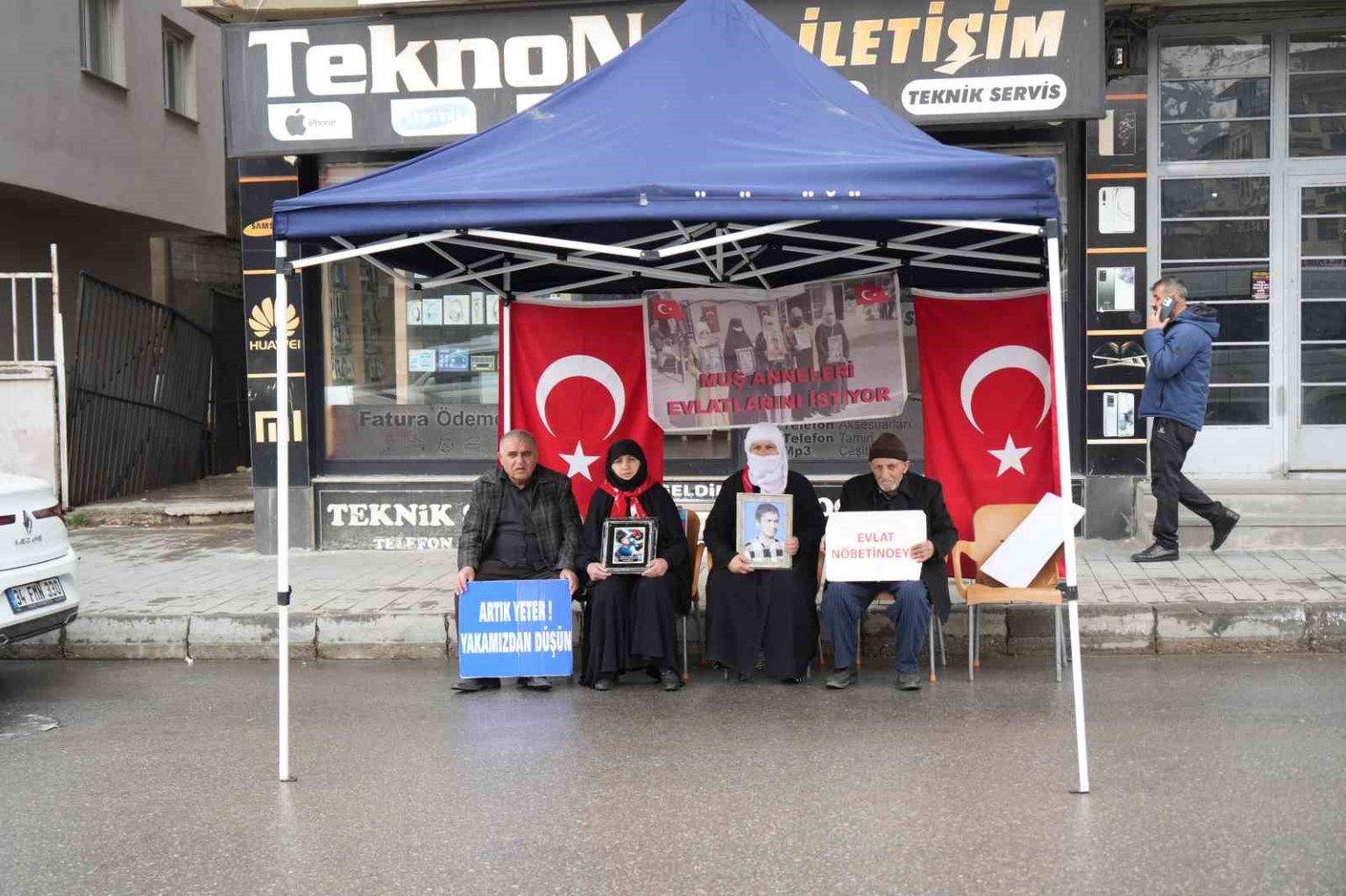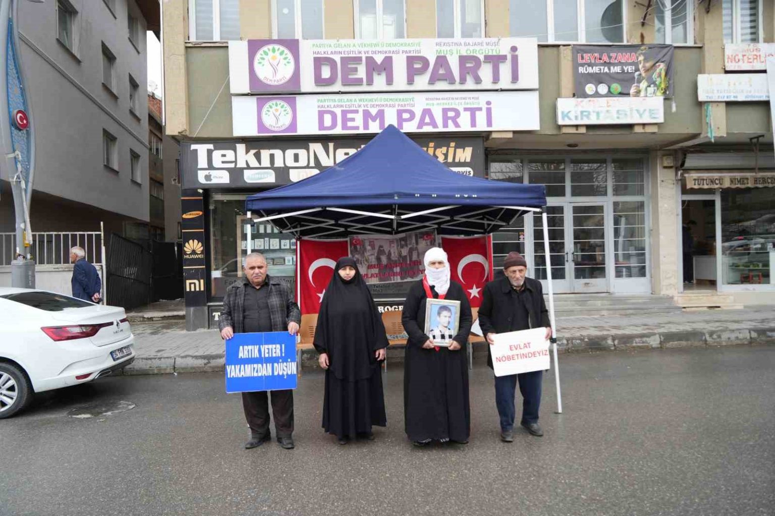 Muş’ta çocuklarının terör örgütü PKK tarafından dağa götürüldüğünü öne süren ailelerin DEM Parti İl Başkanlığı önünde başlattığı evlat nöbeti devam ediyor. Ellerinde çocuklarının fotoğraflarını taşıyan anne ve babalar, “Artık yeter”, “Yakamızdan düşün” ve “Anneler direniyor” yazılı pankartlarla seslerini duyurmaya çalıştı. Zaman zaman duygusal anların yaşandığı eylemde aileler, çocuklarına güvenlik güçlerine teslim olmaları çağrısında bulundu.
