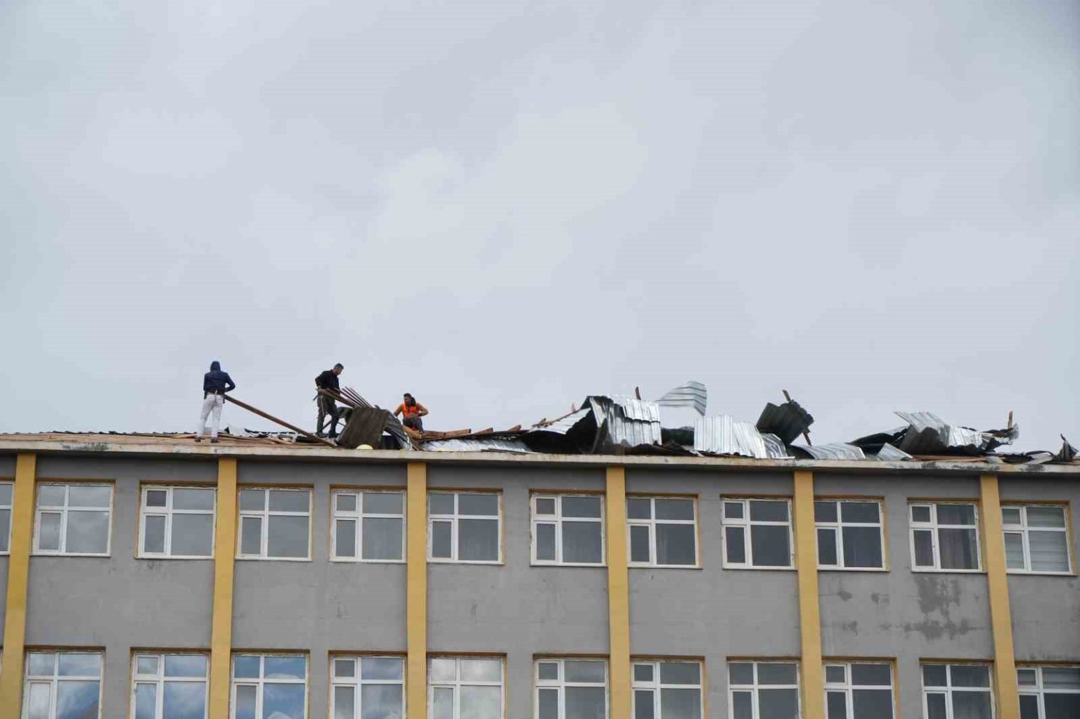 Muş’ta dün akşam saatlerinde etkili olan fırtına nedeniyle Saray Mahallesi’nde bulunan Mehmet Zafer Çağlayan İlk ve Ortaokulu’nun çatısının bir bölümü uçtu. Şiddetli fırtınanın etkisiyle çatıdan kopan sac ve tahta parçaları okul bahçesine savruldu. Olayın yaşandığı saatlerde okulda öğrenci bulunmaması bir facianın önüne geçti. Hasarın tespit edilmesinin ardından ilgili ekipler okulda inceleme yaptı. İl Hıfzıssıhha Kurulu kararı doğrultusunda Mehmet Zafer Çağlayan İlk ve Ortaokulu’nda güvenlik tedbirleri kapsamında eğitime iki gün ara verildi. Hasar gören çatının onarılması için çalışma başlatıldı. Okul bahçesinde çalışmaları inceleyen İl Milli Eğitim Müdürü Abdulkadir Altay, Zafer Çağlayan İlk ve Ortaokulu’nun bulunduğu alanda ani gelişen fırtına nedeniyle okul çatısında hasar meydana geldiğini belirterek, “Çok şükür ki o saatte eğitim öğretim faaliyeti yoktu. Öğrencilerimizi önceden evlerine göndermiştik. Hiçbir öğrencimize, hiçbir canımıza zarar gelmemiştir. Olayı öğrenir öğrenmez teknik ekiplerle birlikte olay yerine intikal ettik. Gerekli güvenlik tedbirlerimizi aldık ve teknik ekiplerimiz bakım onarım çalışmalarını yapmak üzere gerekli hazırlıkları tamamladı. Zaten gezici onarım ekibimiz bulunmaktadır. Teknik ekibimizle birlikte bu konuda gerekli çalışmaları başlattık. Bu sabahtan itibaren çatının hem tadilatı hem de güvenli bir hale getirilmesiyle ilgili süreci başlatmış bulunmaktayız. Ümit ediyorum ki üç-dört gün içerisinde çatımızın yeniden kurgulanması ve kurulumu tamamlanarak okulumuz eğitim öğretime hazır hale getirilecektir. Bu okuldaki öğrencilerimiz için iki gün süreyle eğitime ara verilmiştir. Tekrardan geçmiş olsun. İnşallah kısa sürede öğrencilerimizle tekrar burada buluşacağız” dedi.