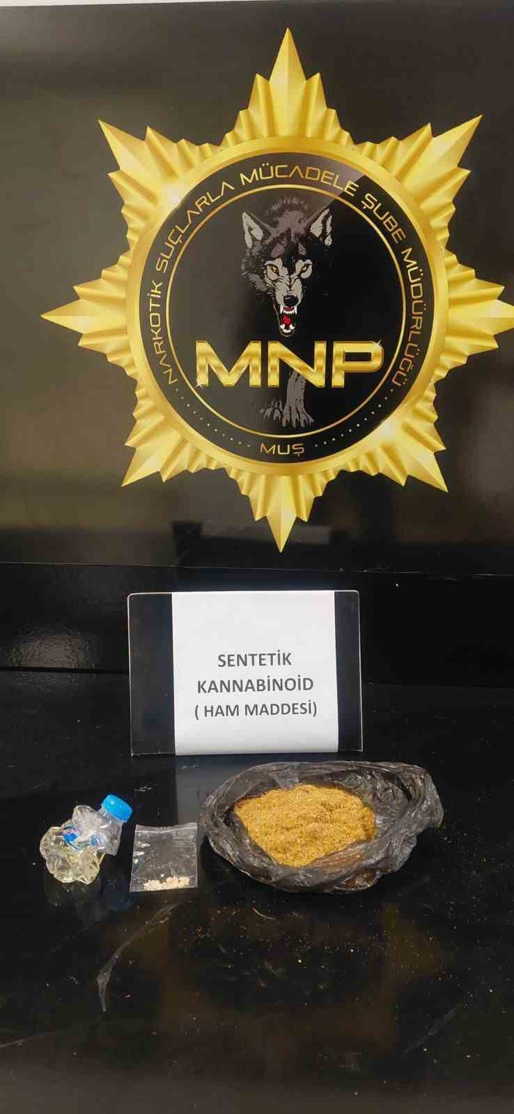 Muş İl Emniyet Müdürlüğü Narkotik Suçlarla Mücadele Şube Müdürlüğü ekiplerince kent merkezinde yapılan kontrollerde sentetik kannabinoid ve uyuşturucu madde yapımında kullanılan malzemeler ele geçirildi.