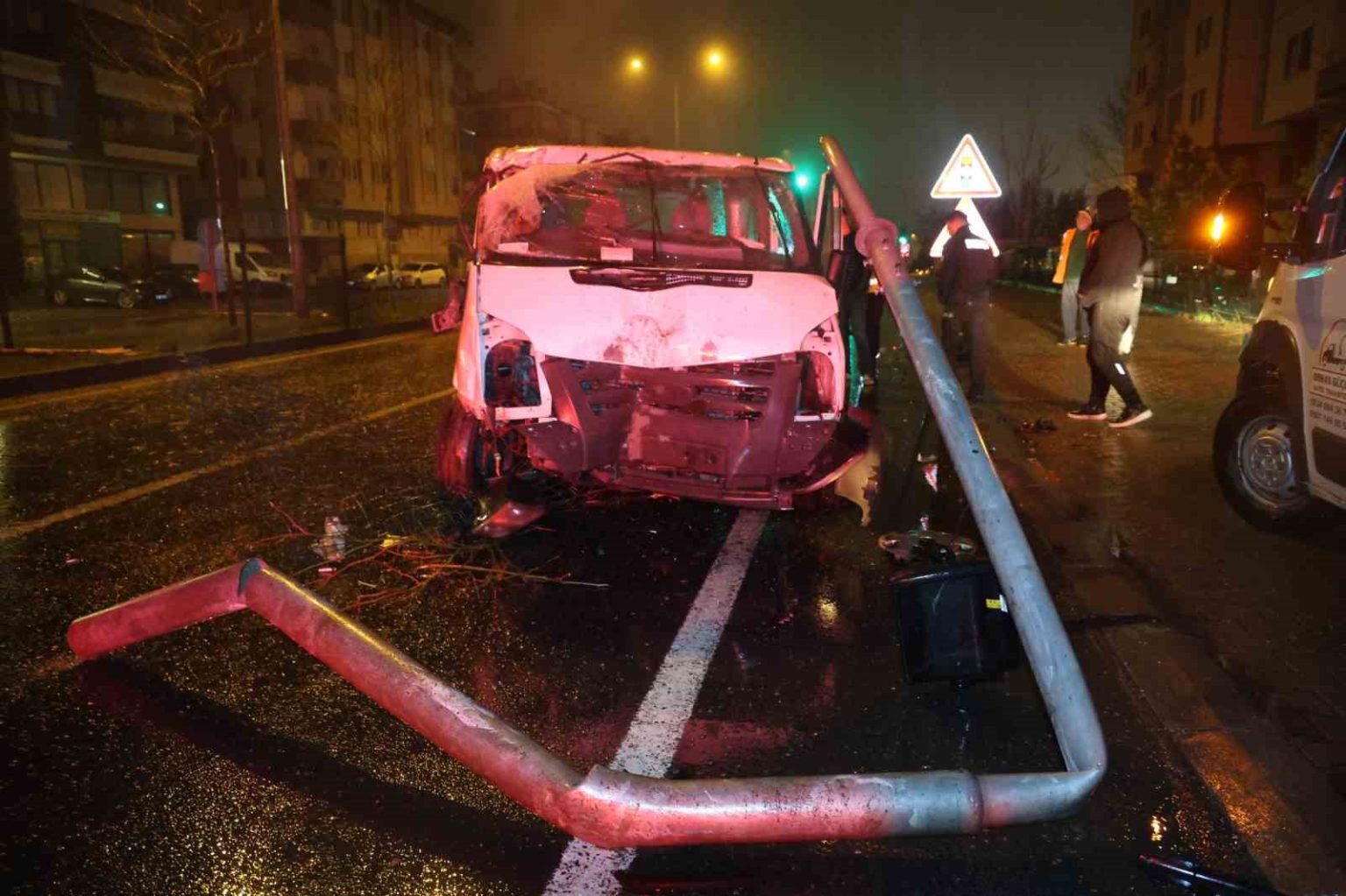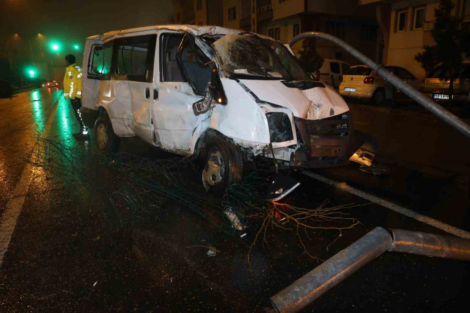 Nevşehir’de aşırı yağış ve dikkatsizlik nedeniyle kontrolden çıkan minibüs, orta refüjde bulunan 5 ağaca ve trafik lambası direğine çarptıktan sonra karşı şeride geçti. Kazada minibüs sürücüsü yaralandı.