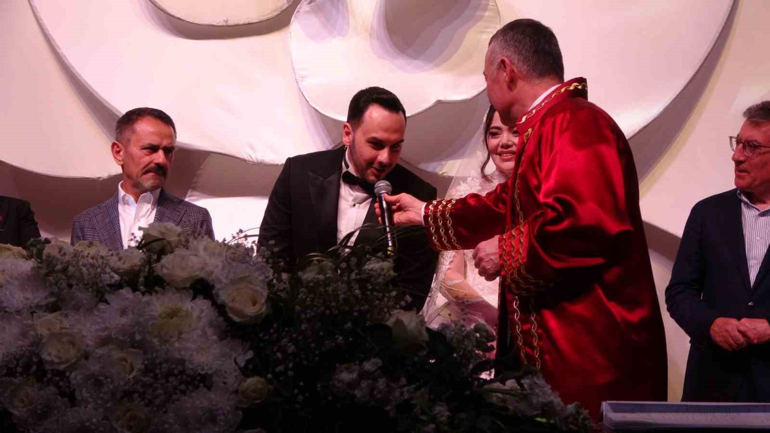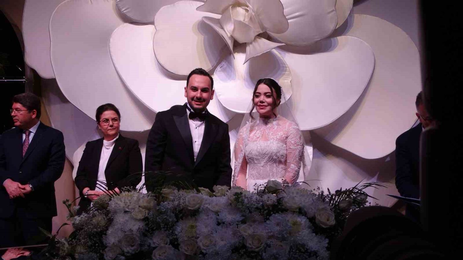 Eski Bilim, Sanayi ve Teknoloji Bakanı Fikri Işık, çifti tebrik ederek evlilik cüzdanını geline takdim etti.