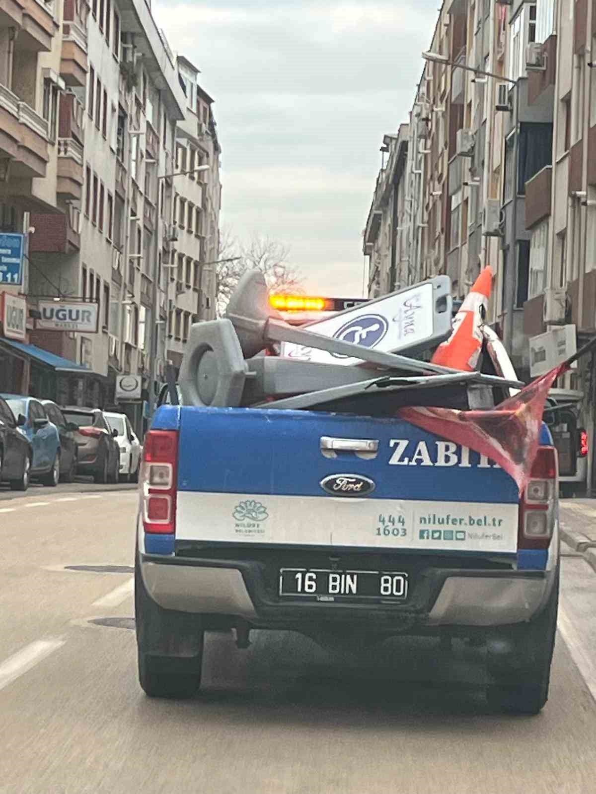 Nilüfer Belediyesi ekipleri; Esentepe ve Karaman mahalleleri ile Beşevler ve Yıldırım caddeleri üzerinde yaya geçişini engelleyen ve görüntü kirliliği oluşturan duba, tabela ve reklam materyallerini topladı.