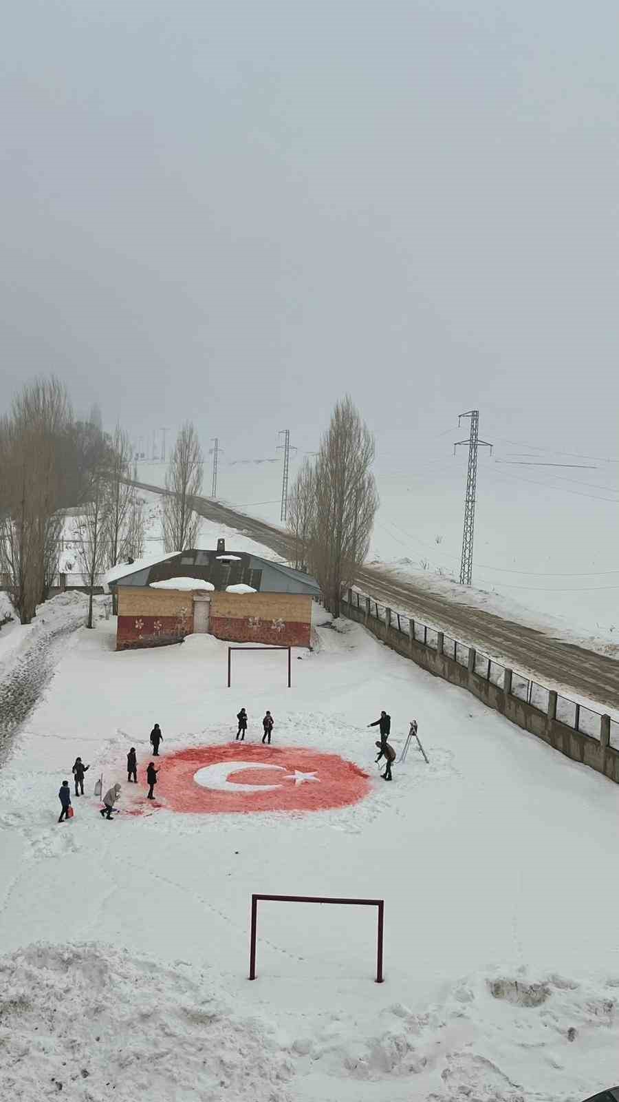 Ağrı’nın Taşlıçay ilçesinde Düzgören İlkokulu ve Ortaokulu öğrencileri kar üzerine Türk bayrağı yaptı.