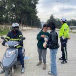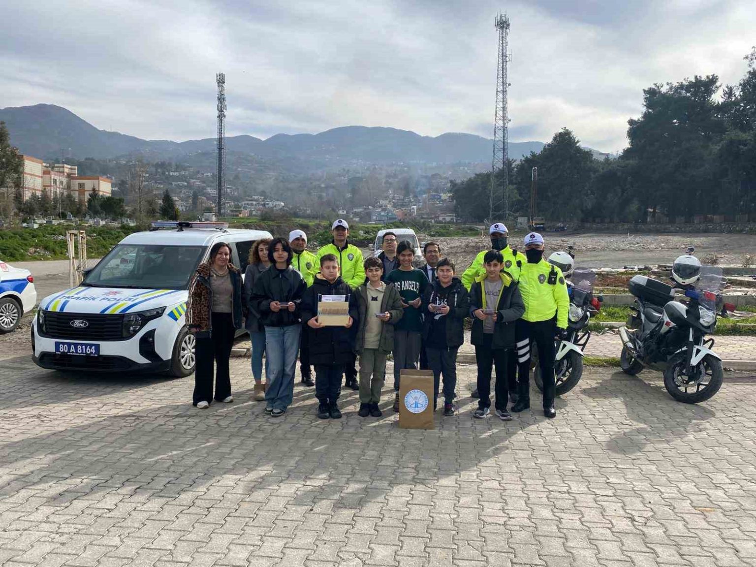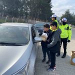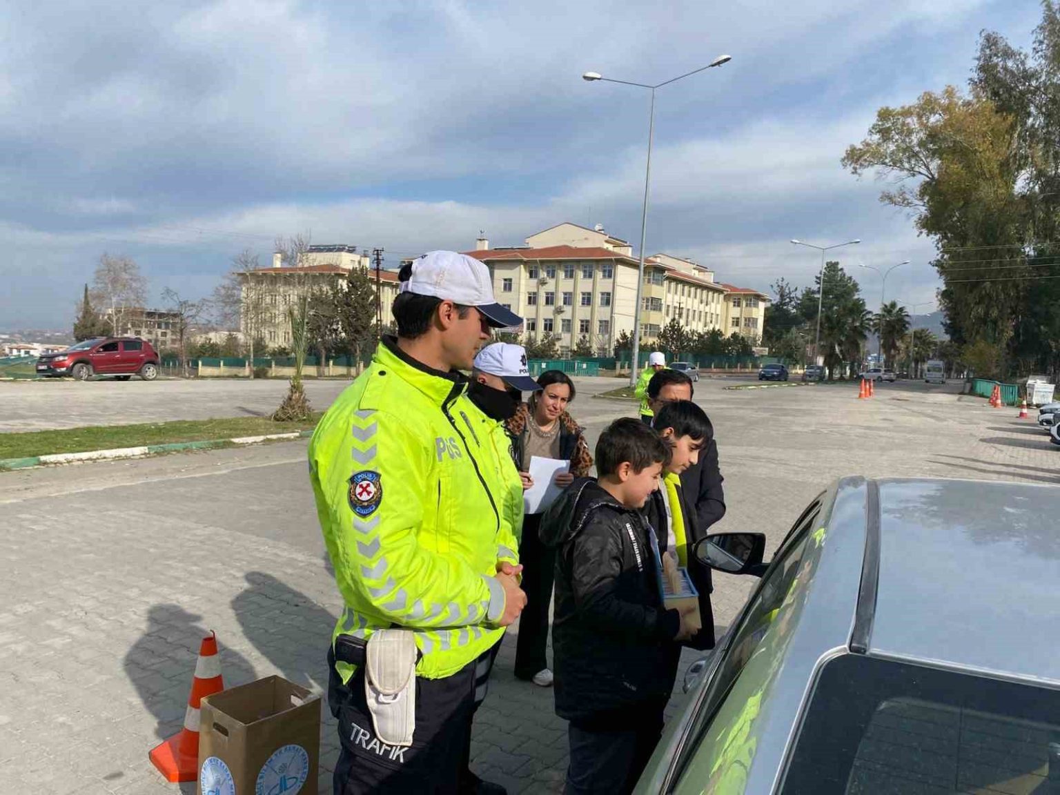 Osmaniye’nin Düziçi ilçesinde öğrenciler, “Trafik Kurallarını Biliyorum, Hediyemi Alıyorum” projesi kapsamında trafikte sürücüleri durdurup işaret levhalarını sordu. Kuralları bilen sürücülere hurma ikram edilirken, bilemeyenlere ise kurallar uygulamalı olarak anlatıldı.