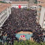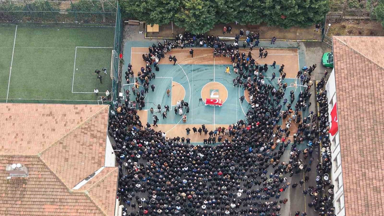Dron ile kaydedilen görüntülerde, okul bahçesini dolduran yüzlerce kişinin düzenli şekilde toplandığı, öğretmenin fotoğrafının yer aldığı alana çiçekler bırakıldığı anlar yer aldı. Öte yandan anma törenine katılımın yoğunluğu dikkat çekti.