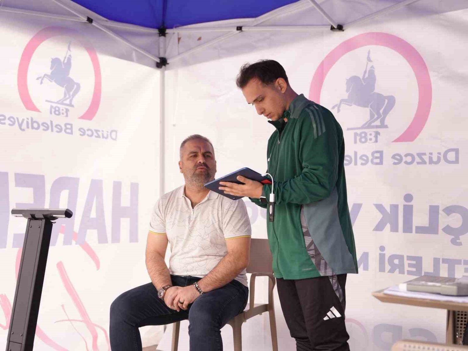 Düzce Belediyesi Gençlik ve Spor Hizmetleri Müdürlüğü’nün başlattığı “Ölç, Fark Et, Hareket Et” kampanyası kapsamında Millet Bahçesi’nde ücretsiz vücut analizleri yapılıyor. Vatandaşlar hem spor tesisleri hakkında bilgilendiriliyor hem de sağlıklı yaşama teşvik ediliyor.