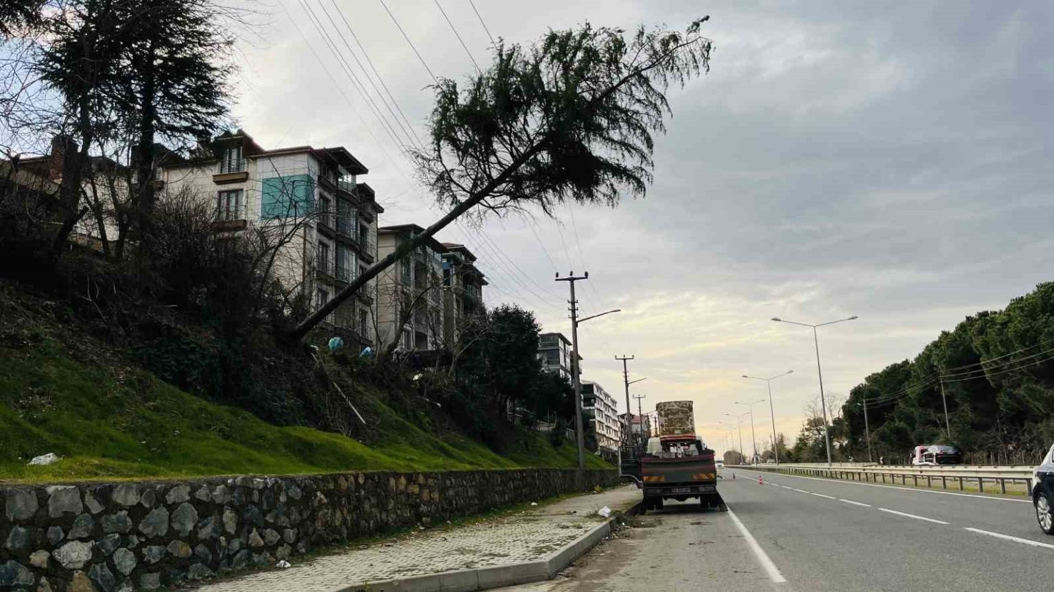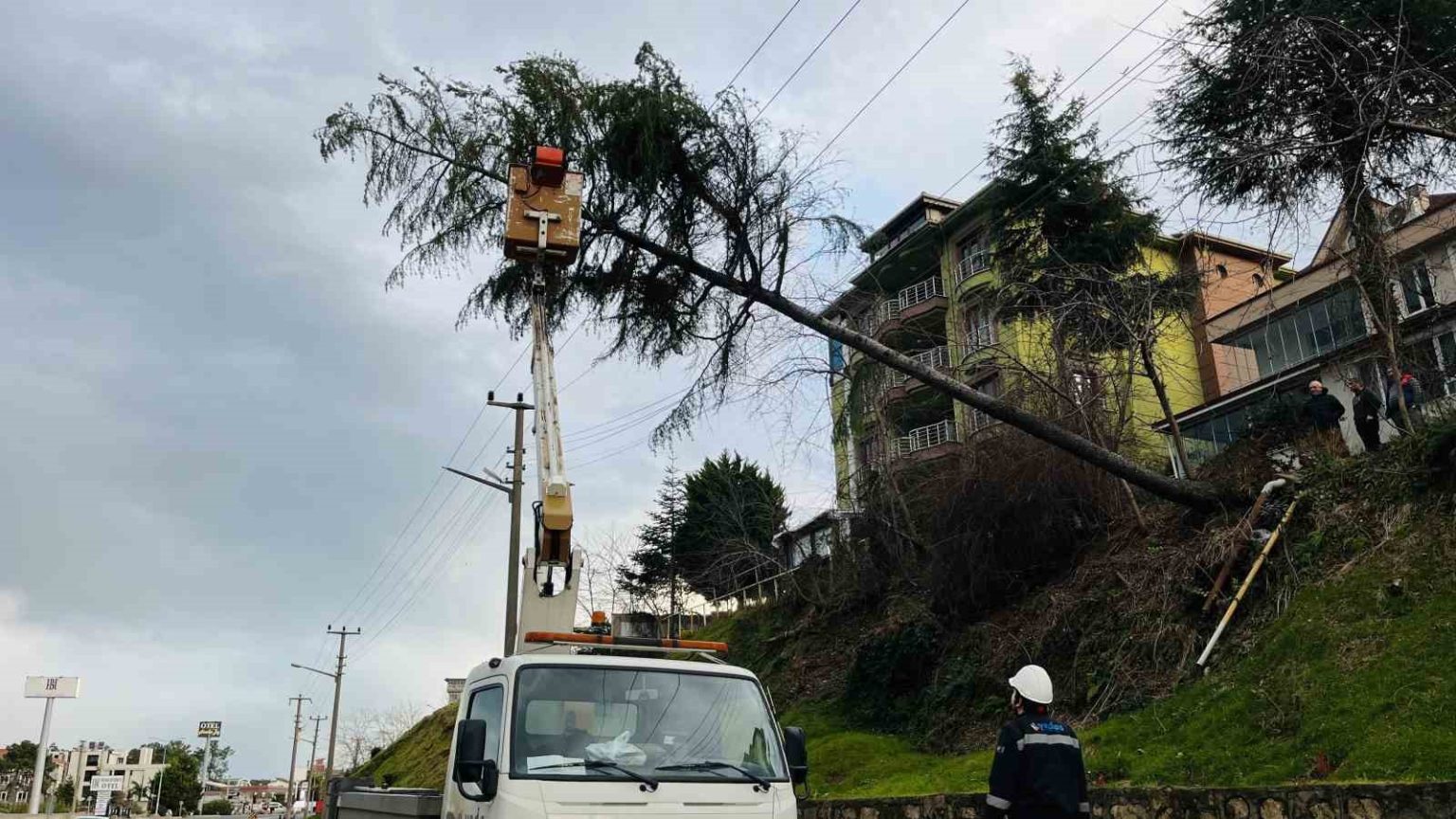 Olay, Gölevi Mahallesi Devlet Sahil Yolu Caddesi üzerinde meydana geldi. Şehir genelinde etkili olan şiddetli rüzgara dayanamayan çam ağacı, kökünden sökülerek yüksek gerilim tellerinin üzerine devrildi. Çevredekilerin ihbarı üzerine olay yerine polis, itfaiye ve elektrik arıza ekipleri sevk edildi. Güvenlik gerekçesiyle bölgedeki elektrik enerjisi kısa süreliğine kesilerek, trafik tek şeritten kontrollü olarak sağlandı. İtfaiye ekipleri muhtemel bir yangın riskine karşı olay yerinde tedbir alırken, elektrik arıza ekipleri tellerin üzerindeki ağacı kesti. Ağacın kaldırılmasının ardından hatlar kontrol edilerek, bölgeye yeniden enerji verildi. Olayda tek şeridi kapanan yol yeniden trafiğe açıldı.