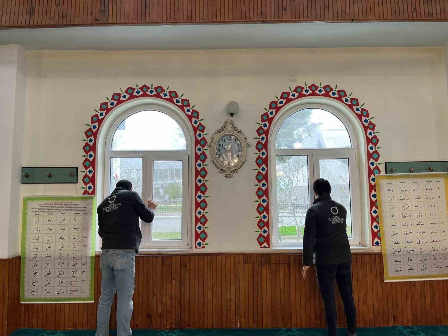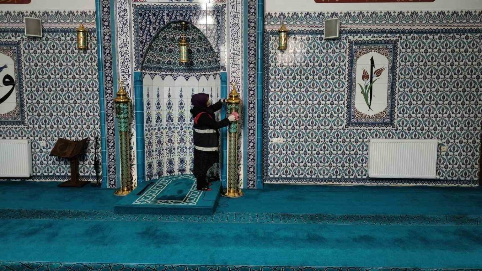 Parklar ve Bahçeler Dairesi Başkanlığı ekipleri tarafından yürütülen çalışmalar kapsamında camilerin iç mekanlarında detaylı temizlik yapılıyor. Halılar özenle süpürülüp temizlenirken, mihrap, minber, kürsü ve pencereler hijyenik hale getiriliyor. Avizeler ve aydınlatma ekipmanları ise tek tek siliniyor.
