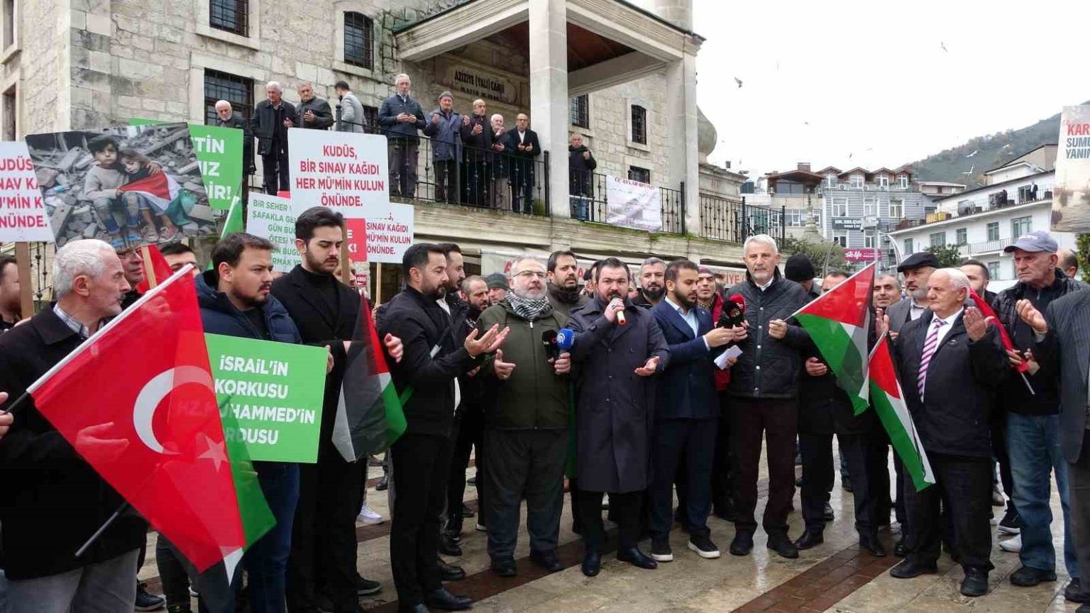Altınordu ilçesinde bulunan Aziziye Camii’nde, cuma namazı sonrası Filistin’e destek amacıyla basın açıklaması düzenlendi. Açıklamaya çeşitli sivil toplum kuruluşları ile vatandaşlar da katıldı.