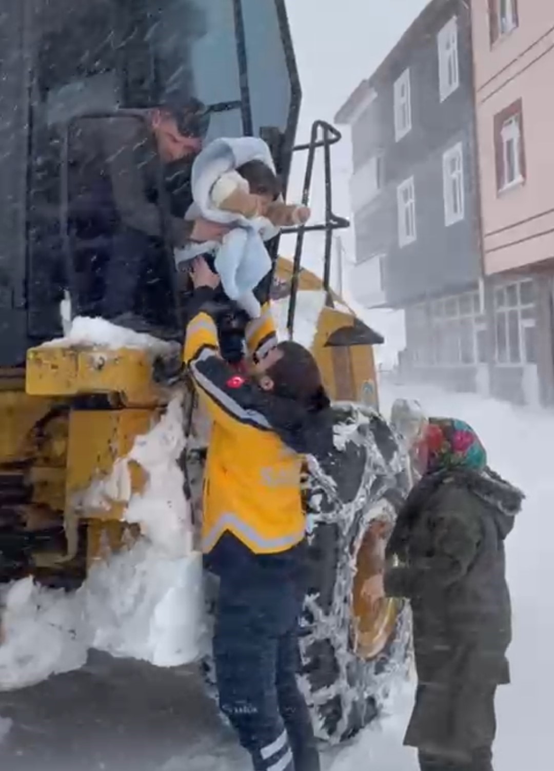 Ordu’nun Çaybaşı ilçesinde yolu kardan kapanan mahallede hastalanan bebek, iş makineleri ve ekiplerin yardımıyla hastaneye ulaştırıldı.