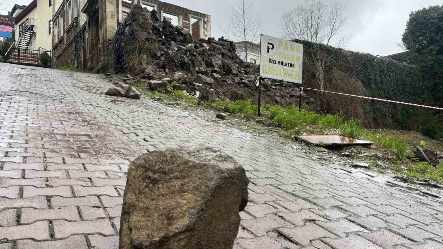 İstinat duvarının kontrollü olarak belediye ekipler tarafından olabilecek tehlikeye karşı yıkılacağı bildirildi.